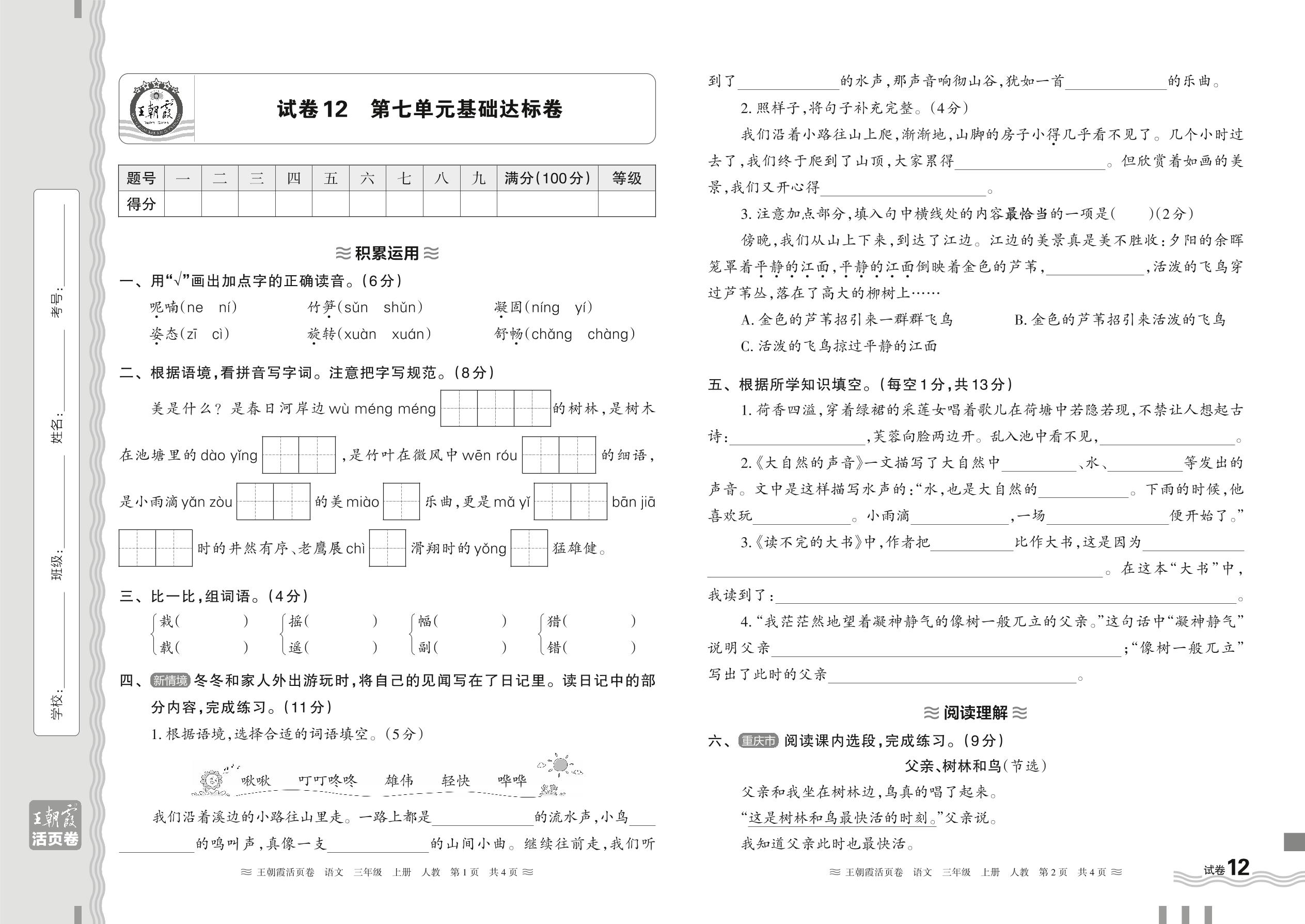 2024秋上册三年级语文人教版 第七单元基础达标卷【12】