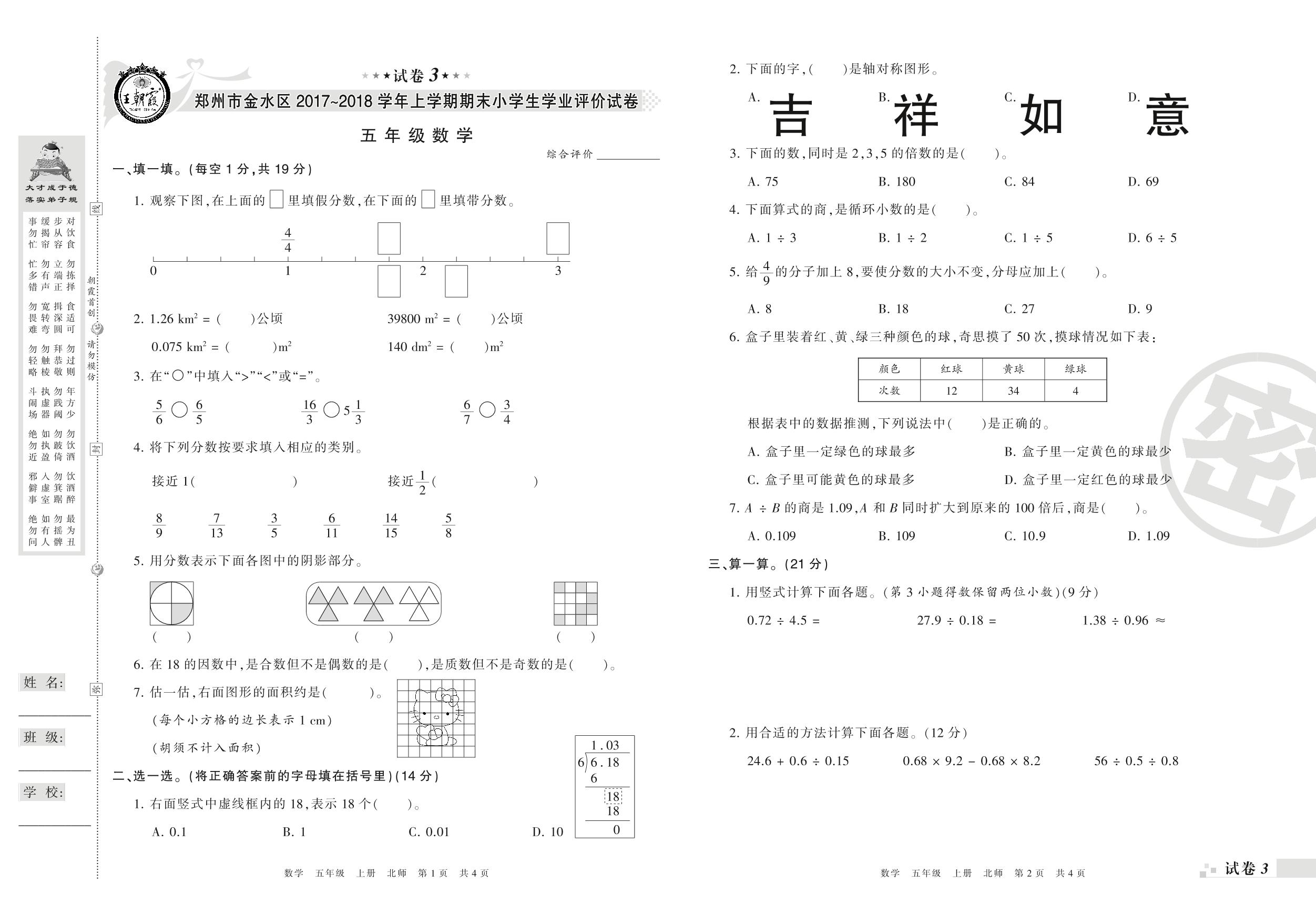 2017-2018学年第一学期郑州市金水区五年级数学试卷(北师版)【3】