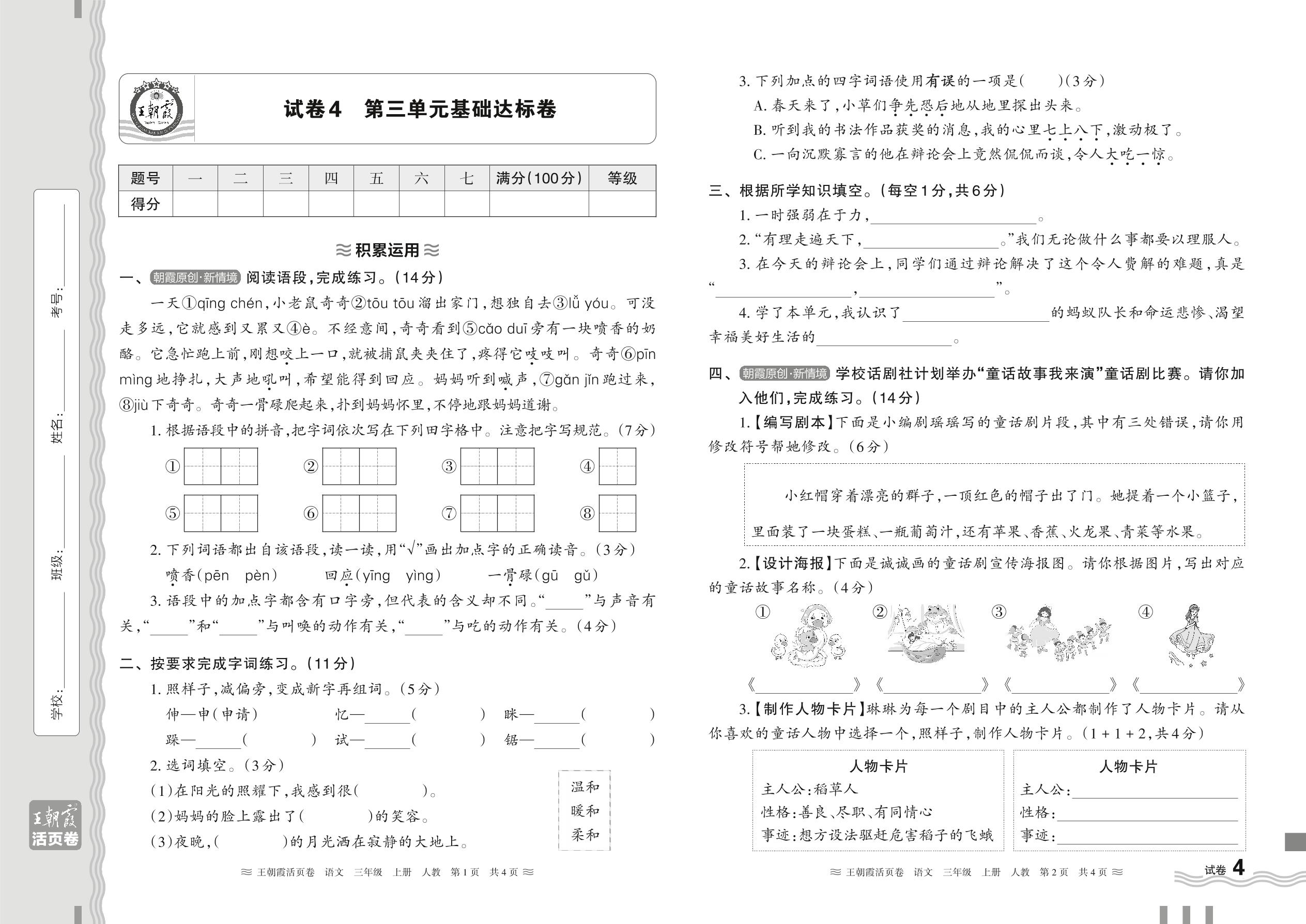 2024秋上册三年级语文人教版 第三单元基础达标卷【4】