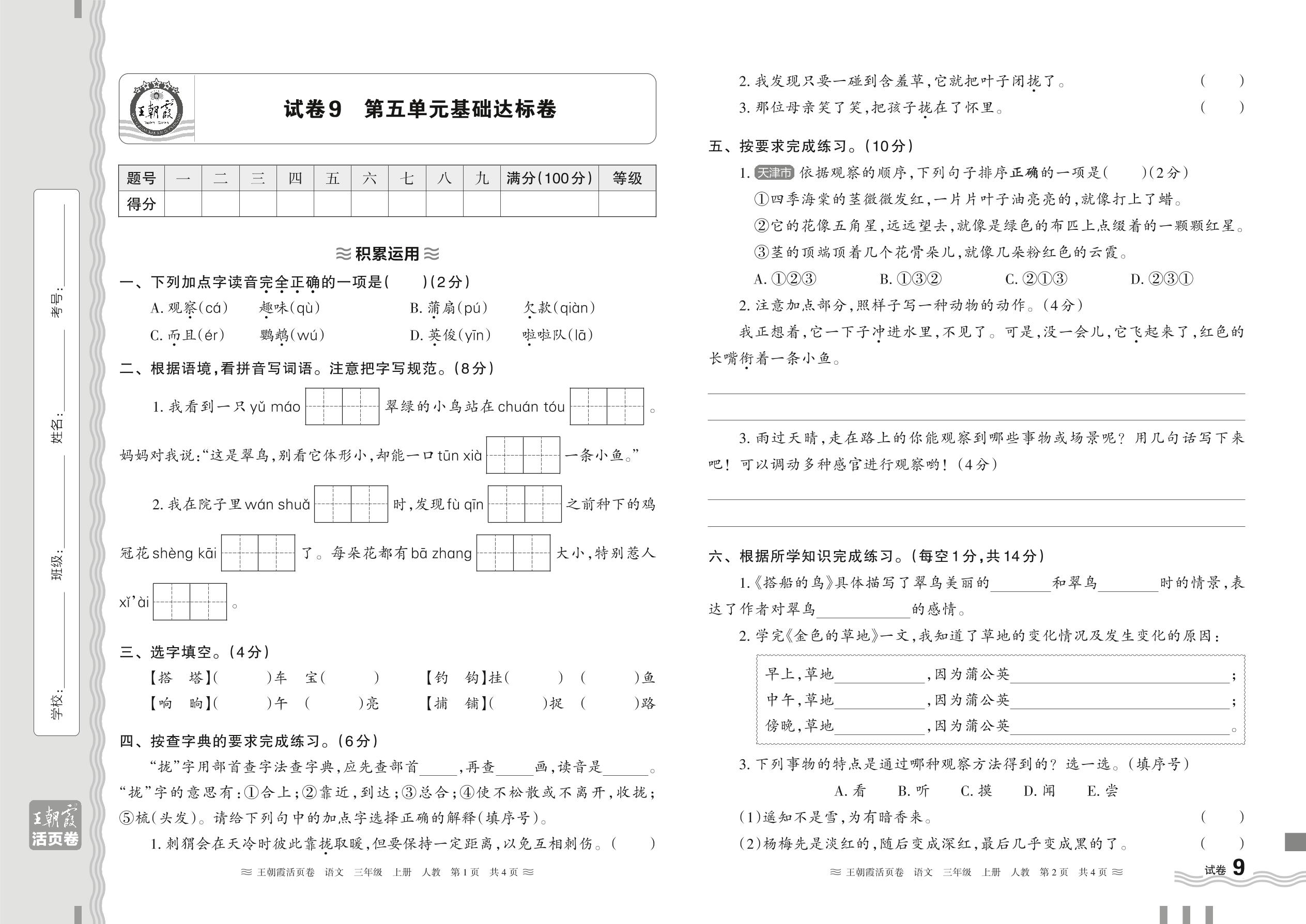 2024秋上册三年级语文人教版 第五单元基础达标卷【9】
