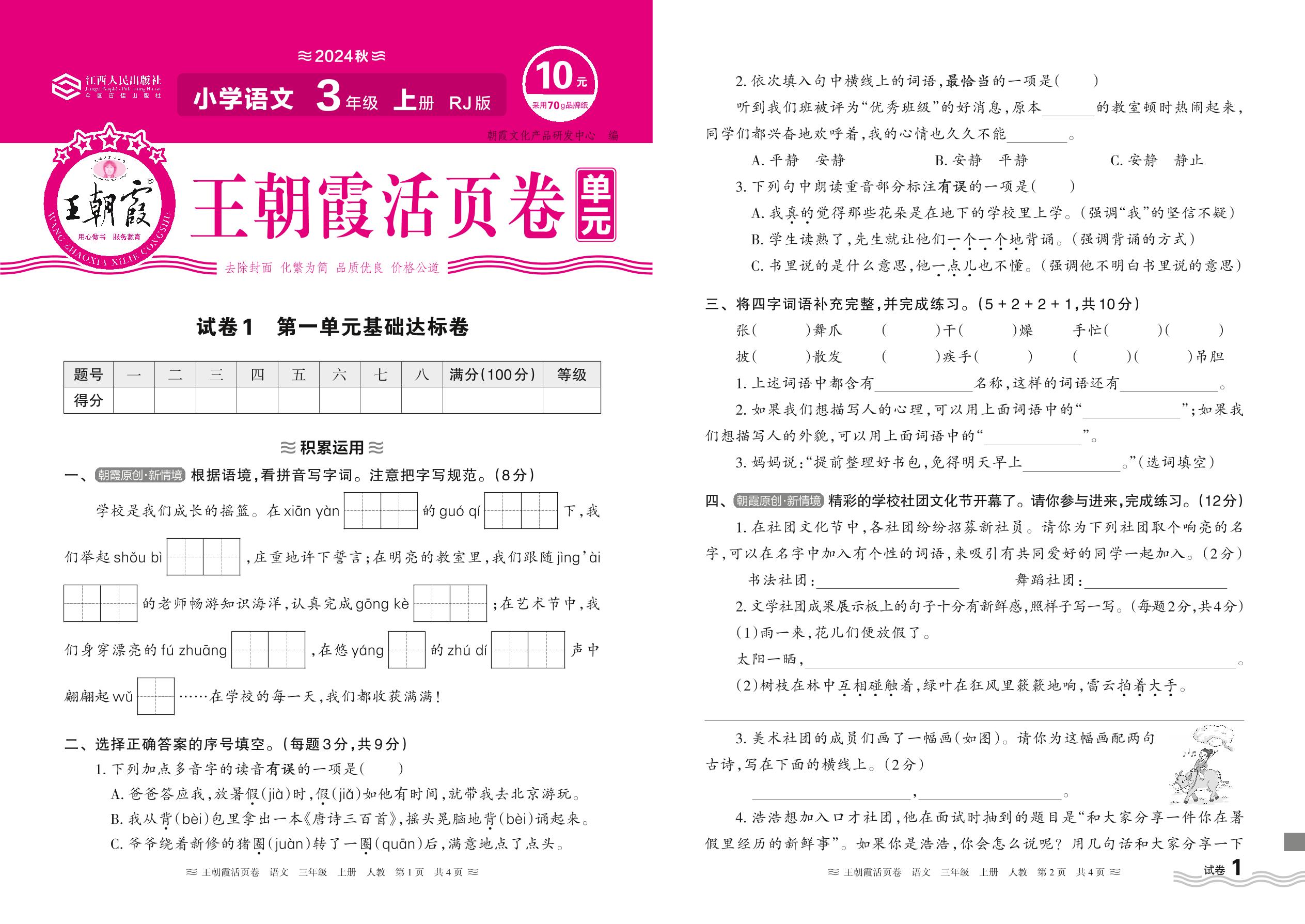 2024秋上册三年级语文人教版 第一单元基础达标卷【1】