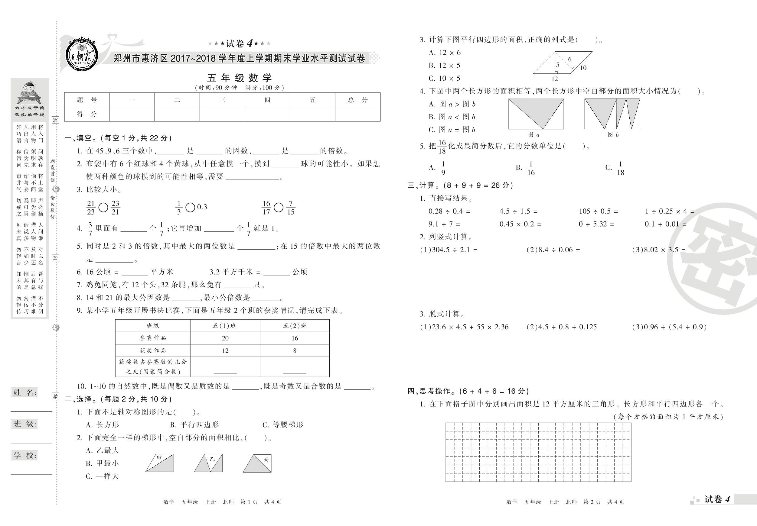 2017-2018学年第一学期郑州市惠济区五年级数学试卷(北师版)【4】