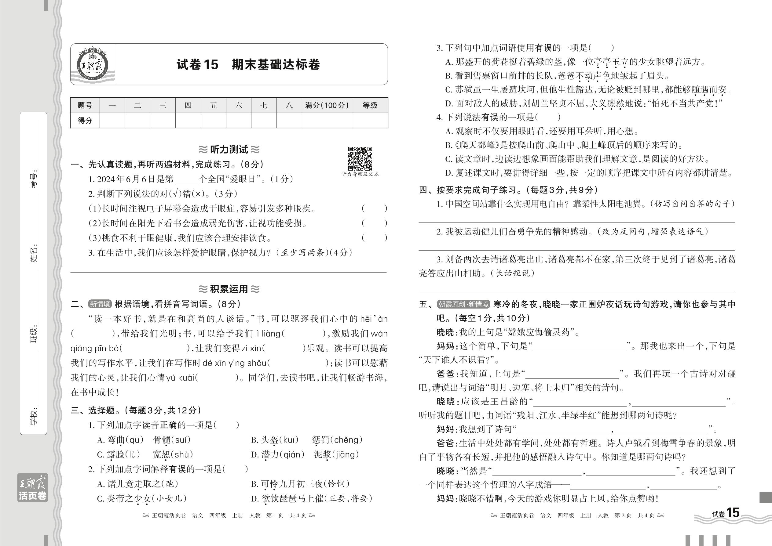2024秋上册四年级语文人教版 期末基础达标卷【15】