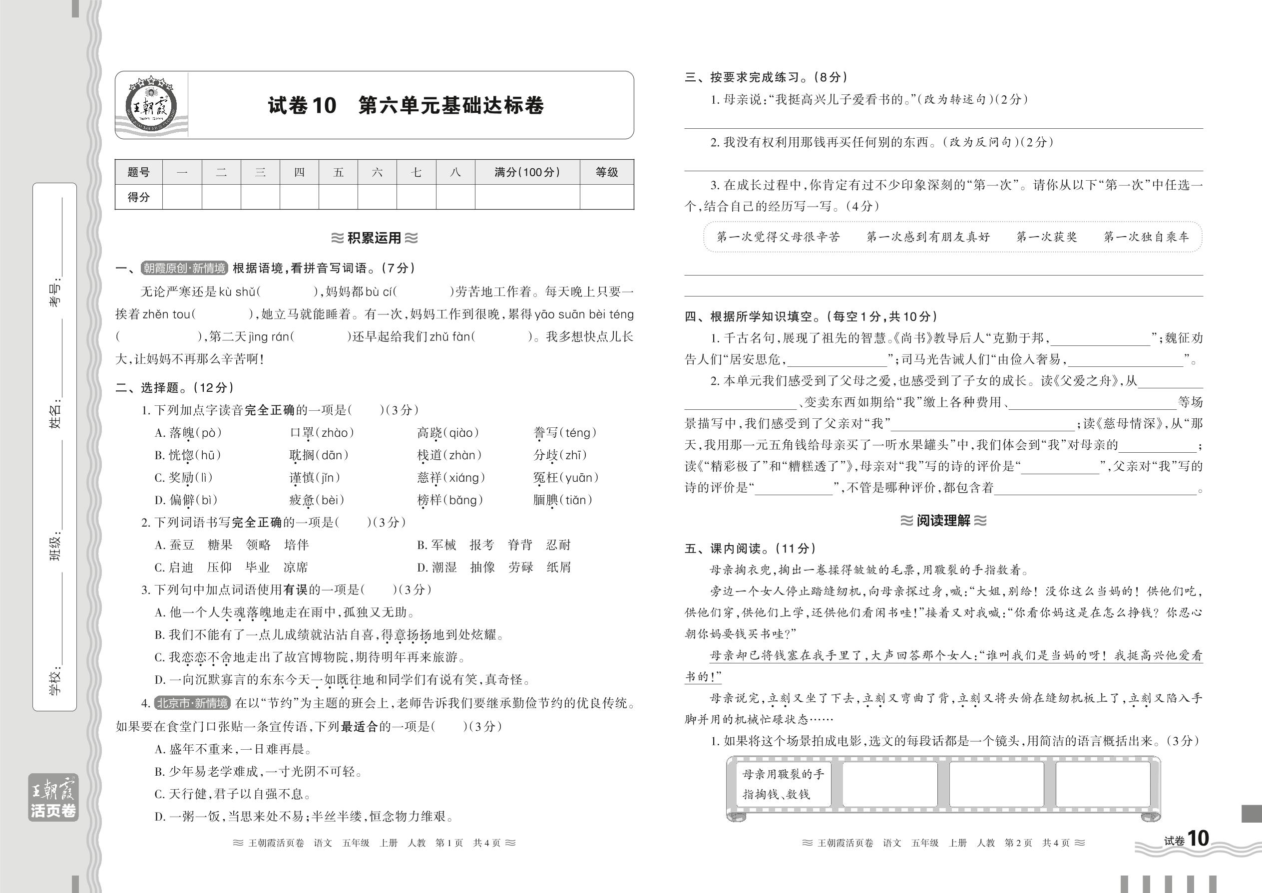 2024秋上册五年级语文人教版 第六单元基础达标卷【10】