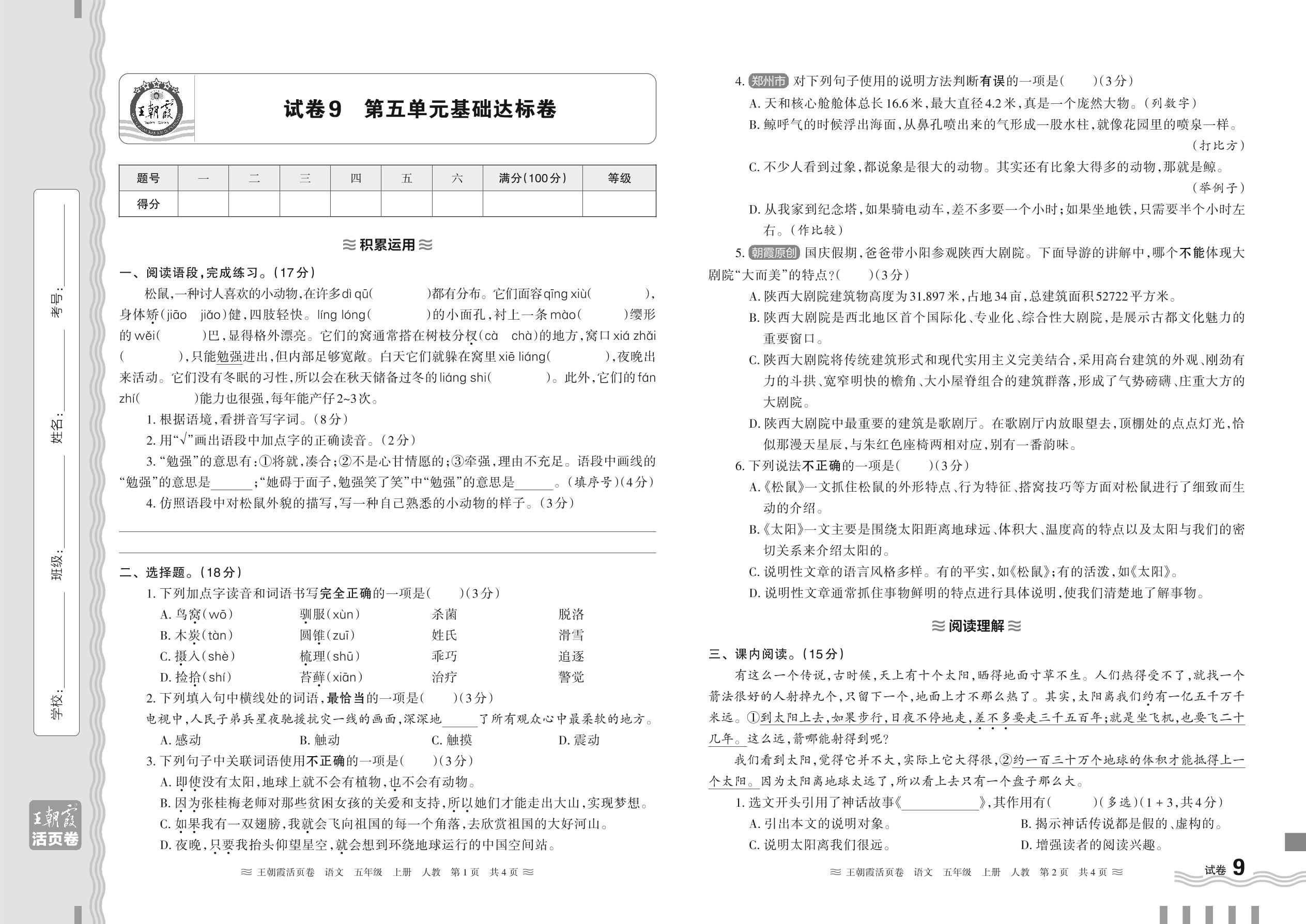 2024秋上册五年级语文人教版 第五单元基础达标卷【9】