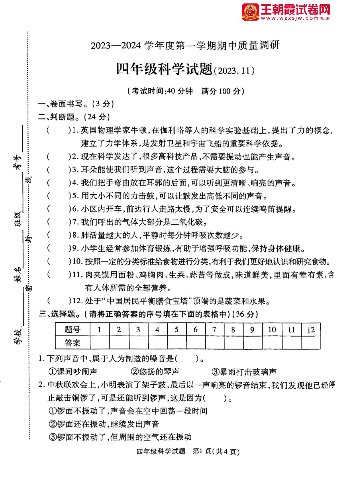 江苏省徐州市沛县2023-2024学年度第一学期期中质量调研四年级科学(教科版)