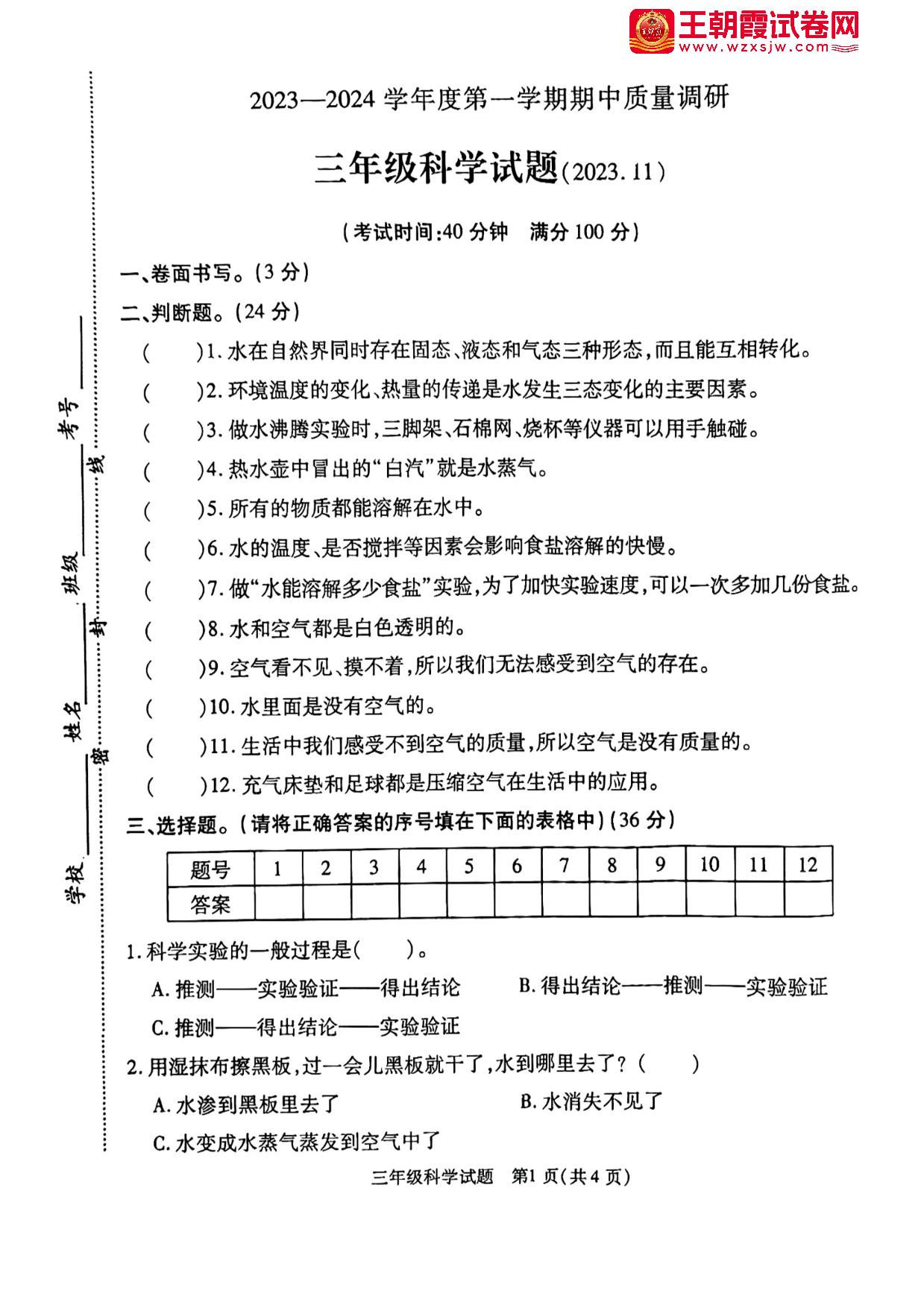 江苏省徐州市沛县2023-2024学年度第一学期期中质量调研三年级科学(教科版)