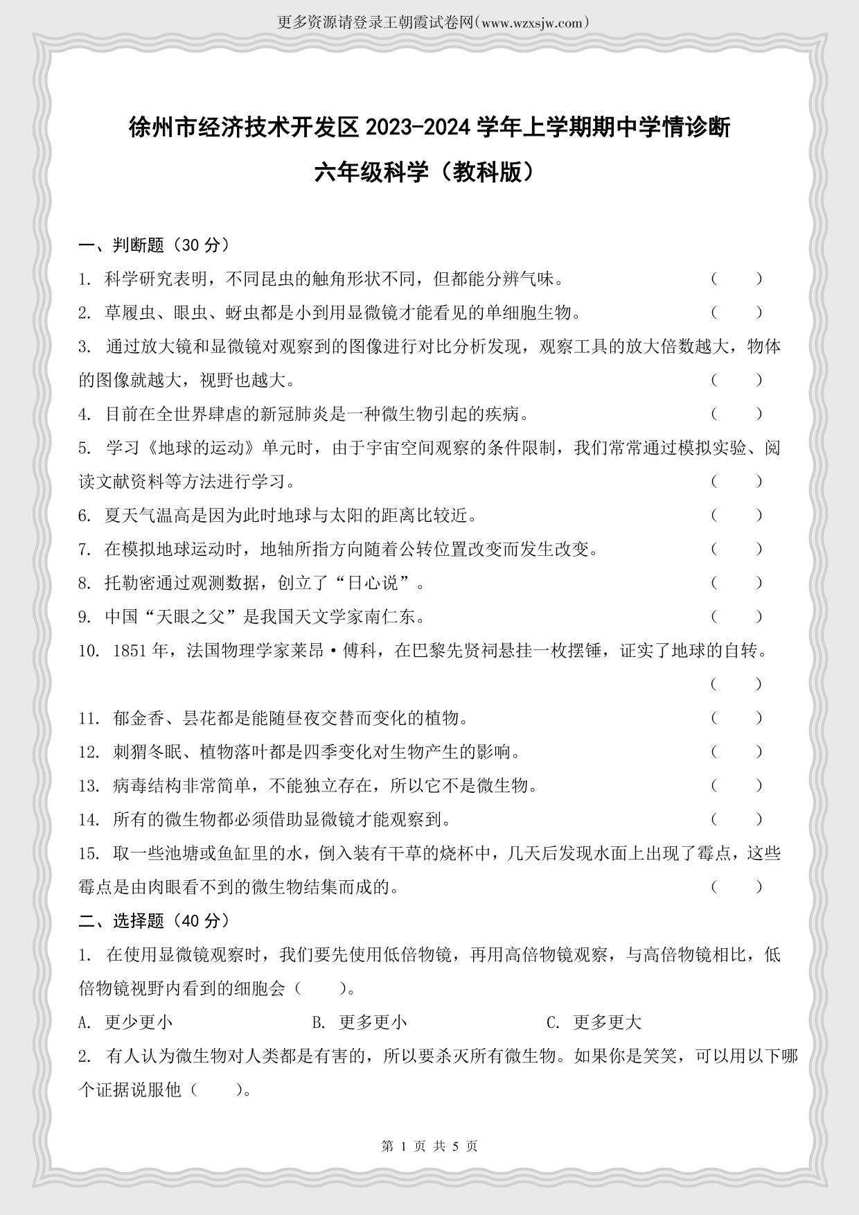江苏省徐州经济技术开发区2023-2024学年上学期期中学情诊断六年级科学(教科版)