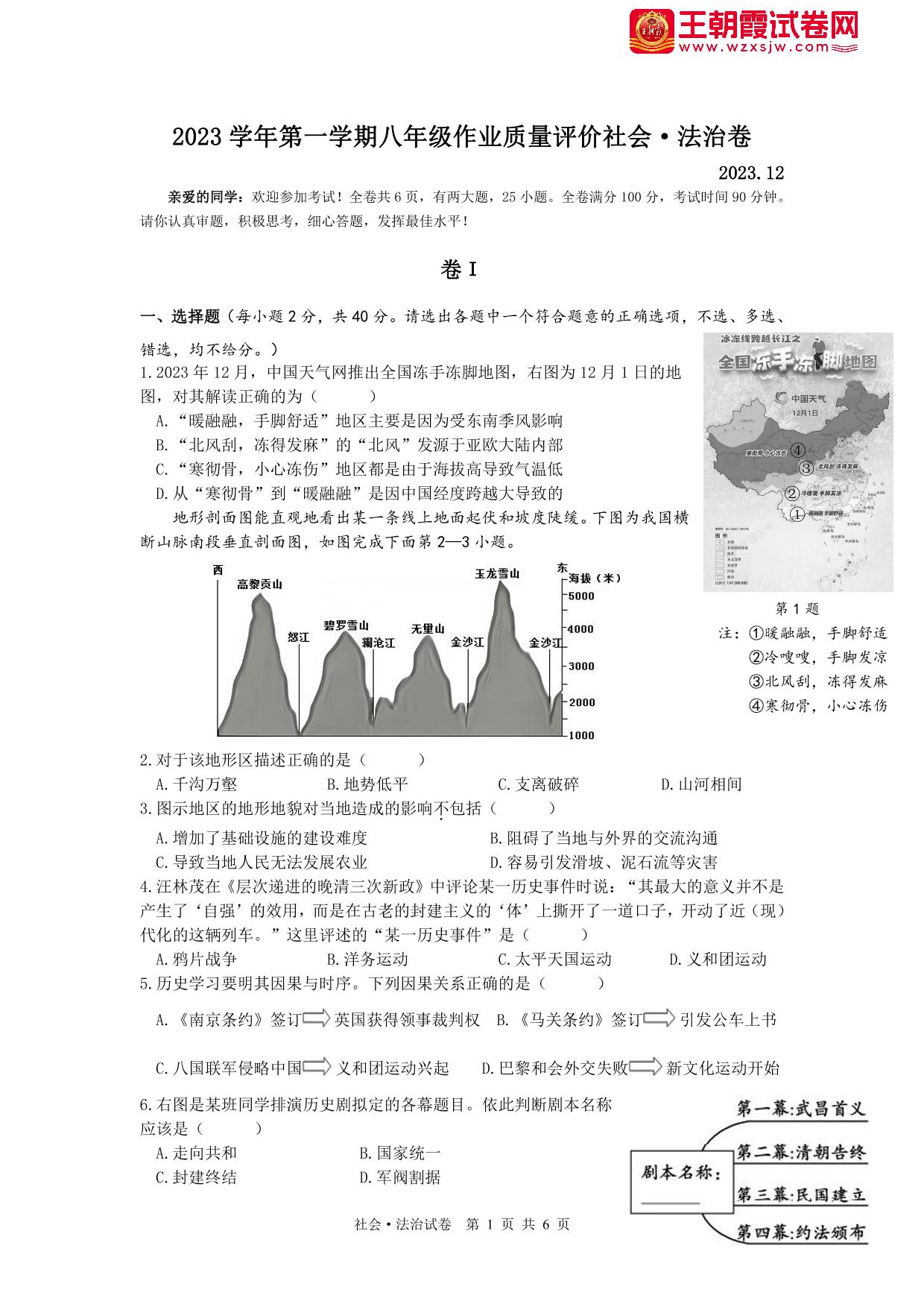 浙江省温州市龙湾区2023-2024学年第一学期作业质量评价(月考)八年级历史与社会、道德与法治综合卷