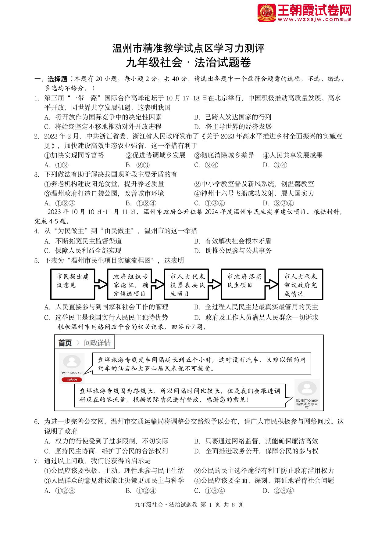 浙江省温州市精准教学试点区2023-2024学年第一学期学习力测评(月考)九年级历史与社会、道德与法治综合卷