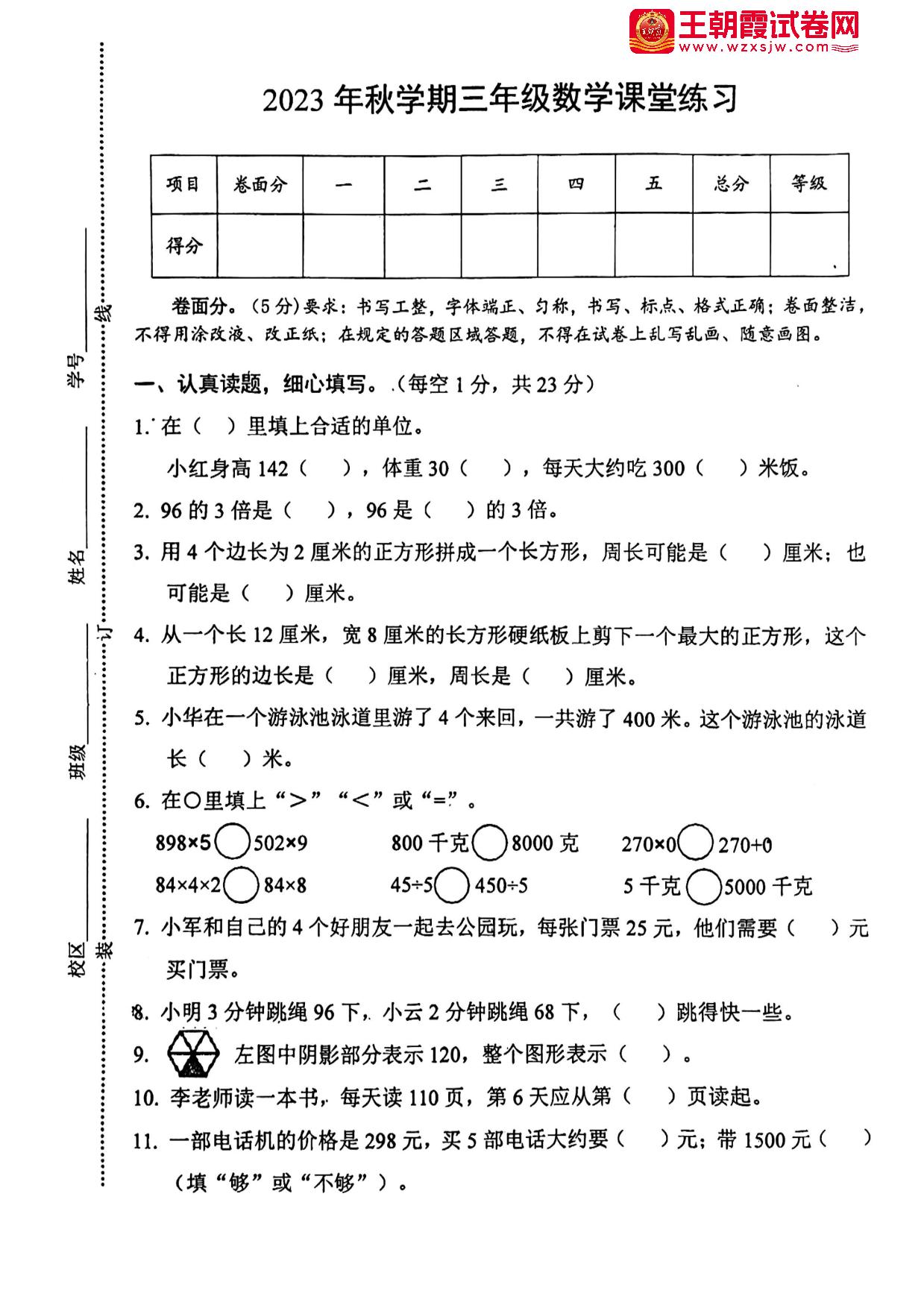江苏省盐城市东台市第五联盟2023-2024学年上学期期中课堂练习三年级数学(苏教版)