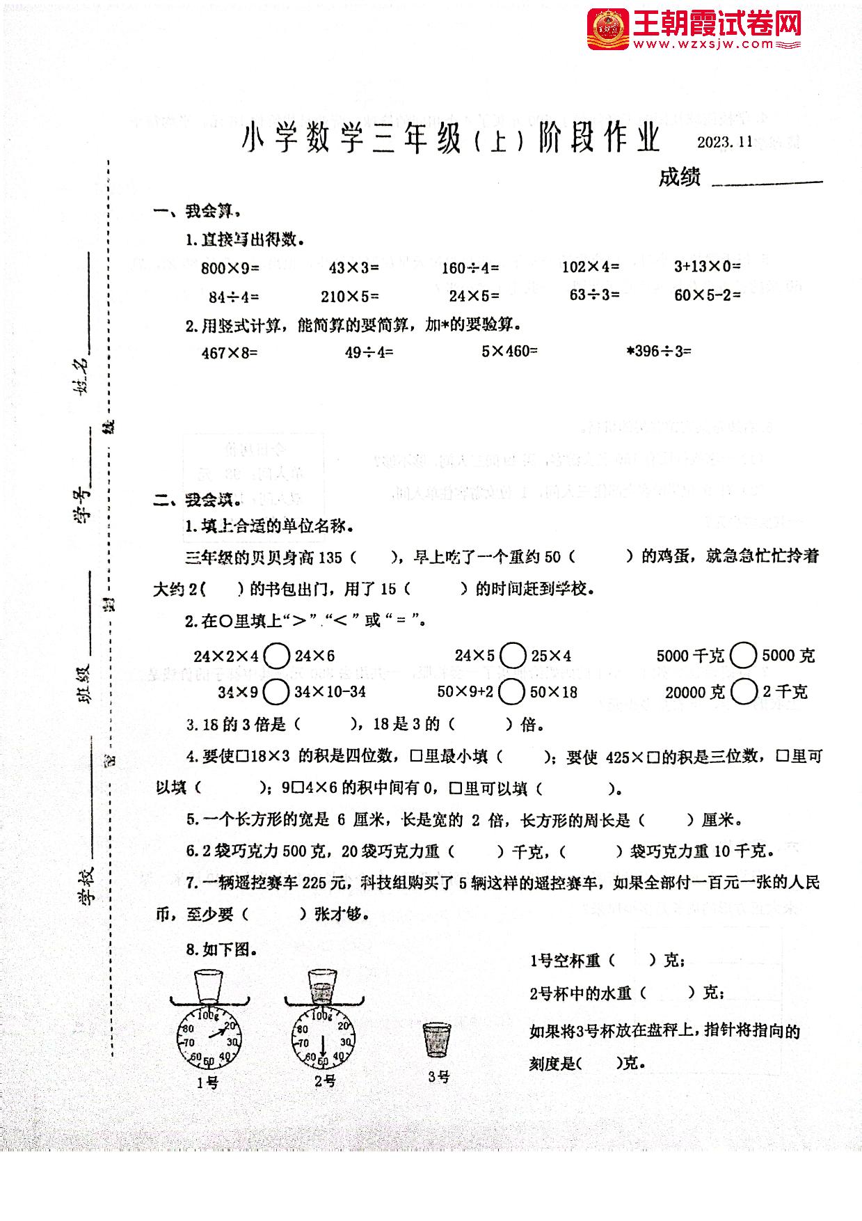 江苏省泰州市兴化市2023-2024学年上学期期中阶段作业三年级数学(苏教版)