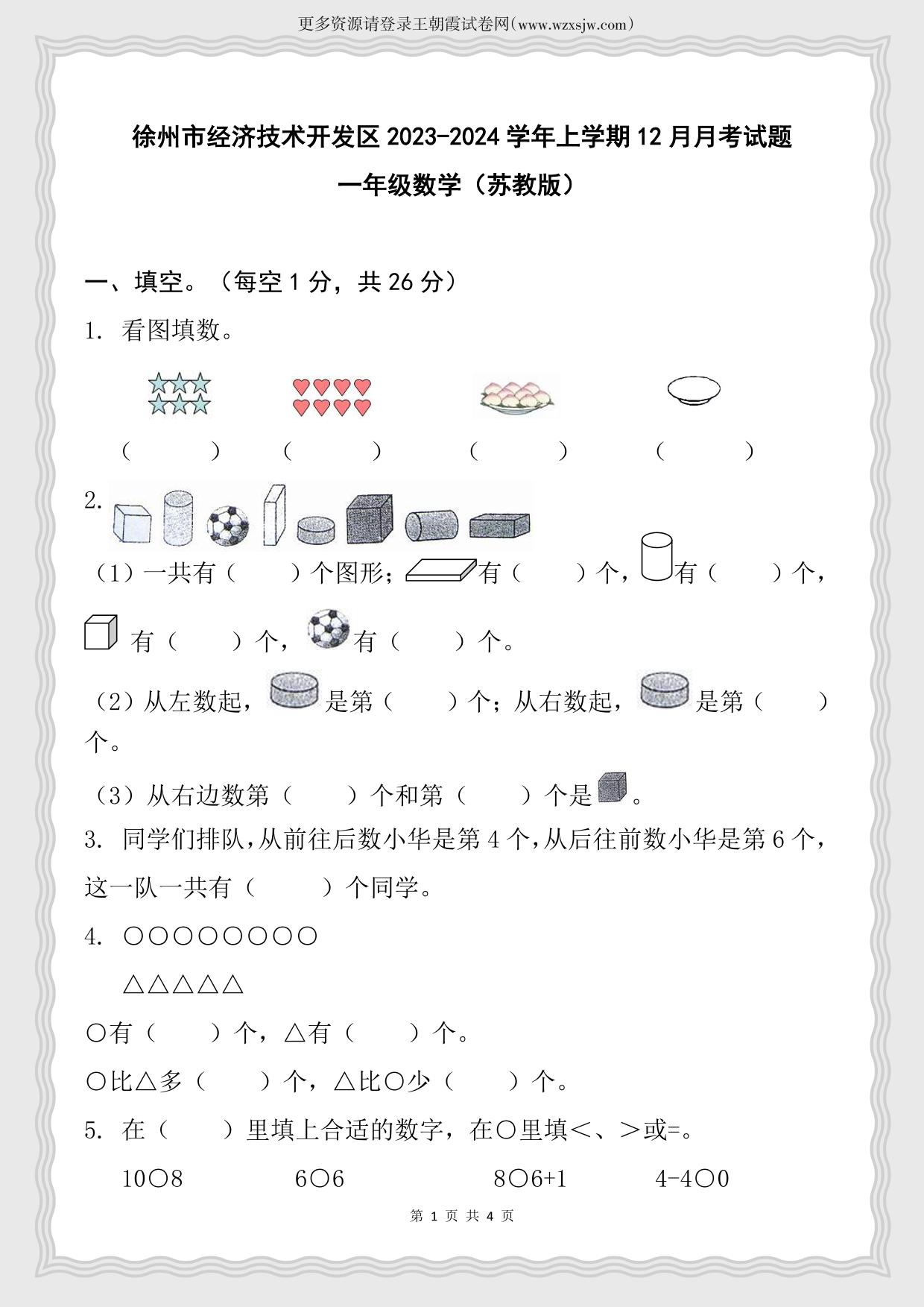 江苏省徐州经济技术开发区2023-2024学年上学期12月月考试题一年级数学(苏教版)