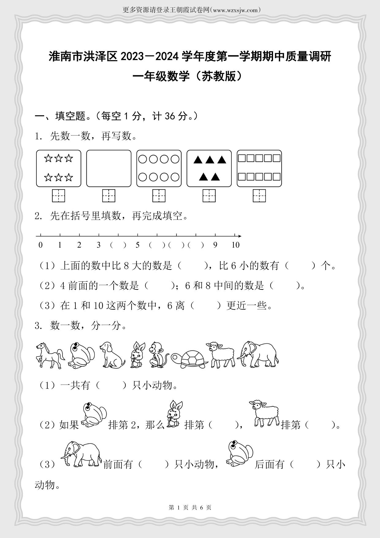 江苏省淮安市洪泽区2023-2024学年度第一学期期中质量调研一年级数学(苏教版)