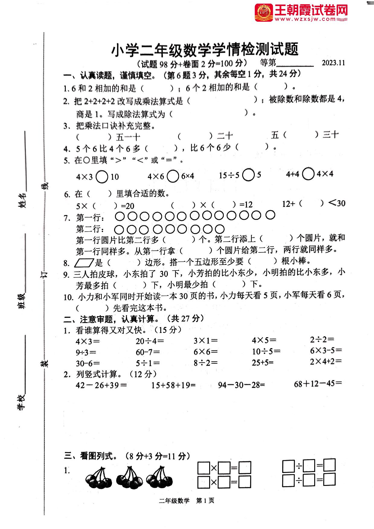 江苏省宿迁市2023-2024学年上学期学情检测试题二年级数学(苏教版)
