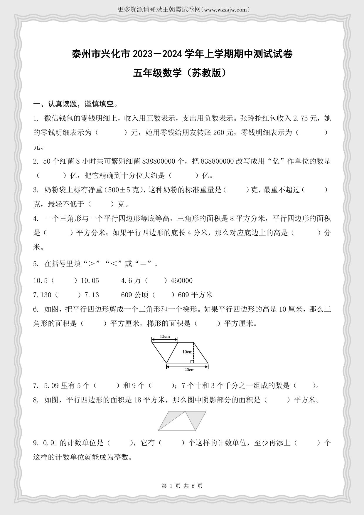 江苏省泰州市兴化市2023-2024学年上学期期中测试试卷五年级数学(苏教版)