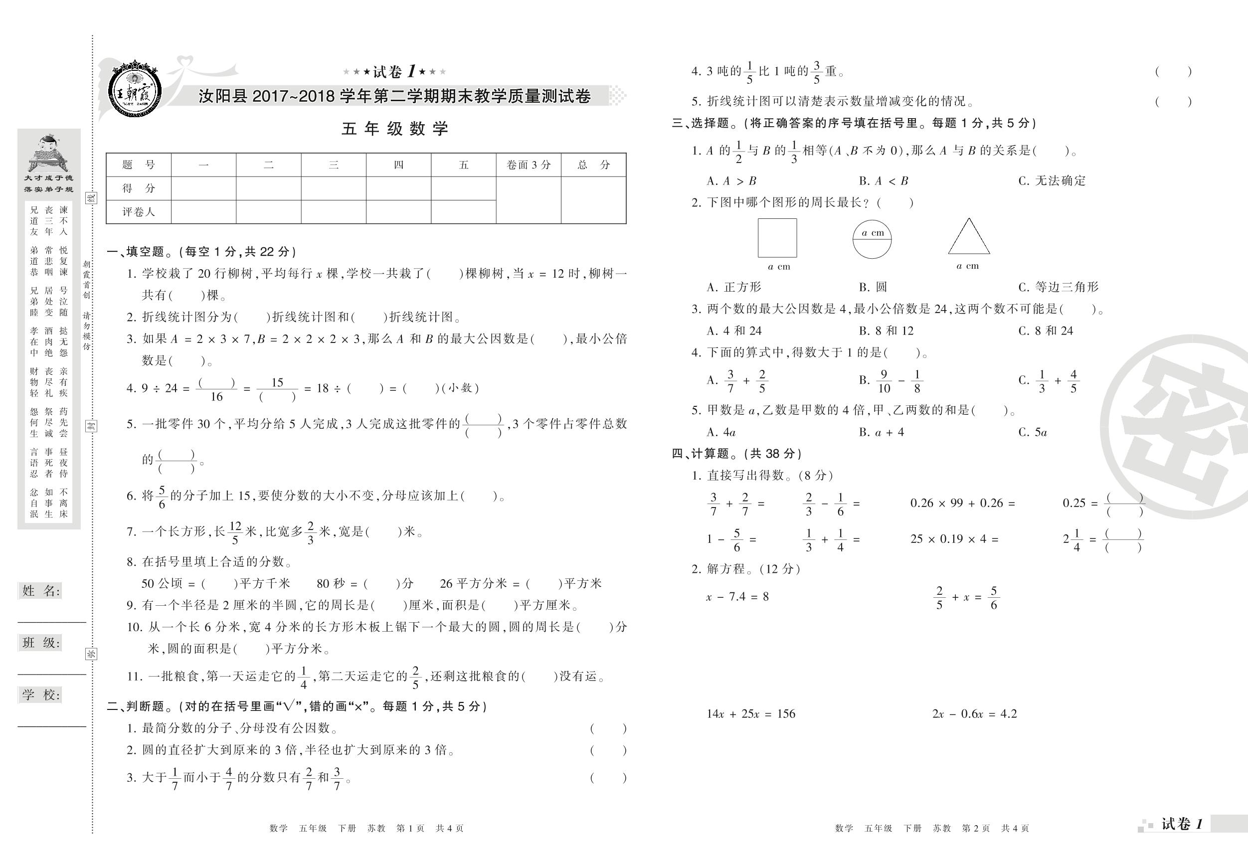 2017-2018学年第二学期洛阳市汝阳县五年级数学试卷(苏教版)【1】