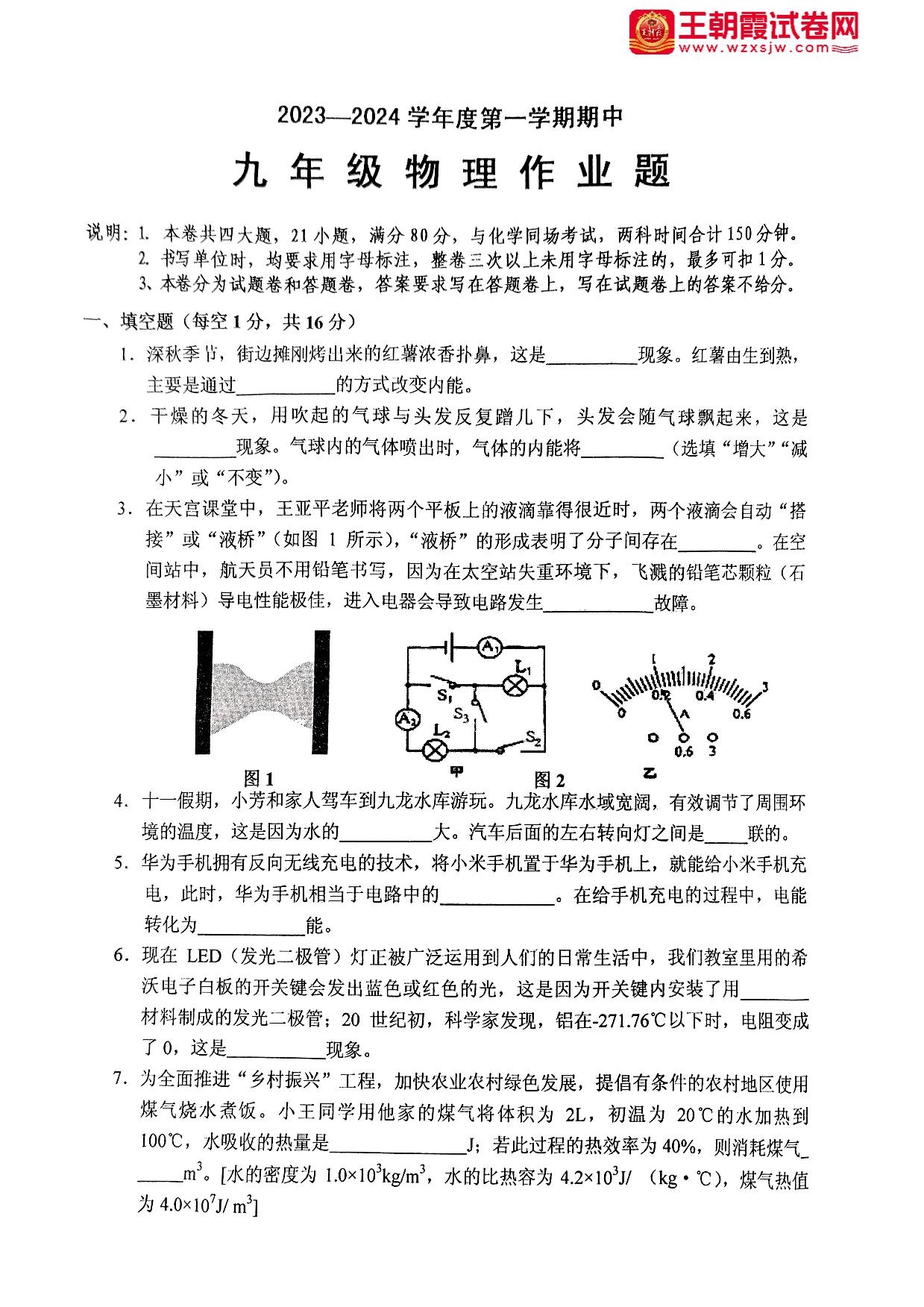 江西省鹰潭市余江区2023-2024学年第一学期期中考试试题九年级物理(人教版)