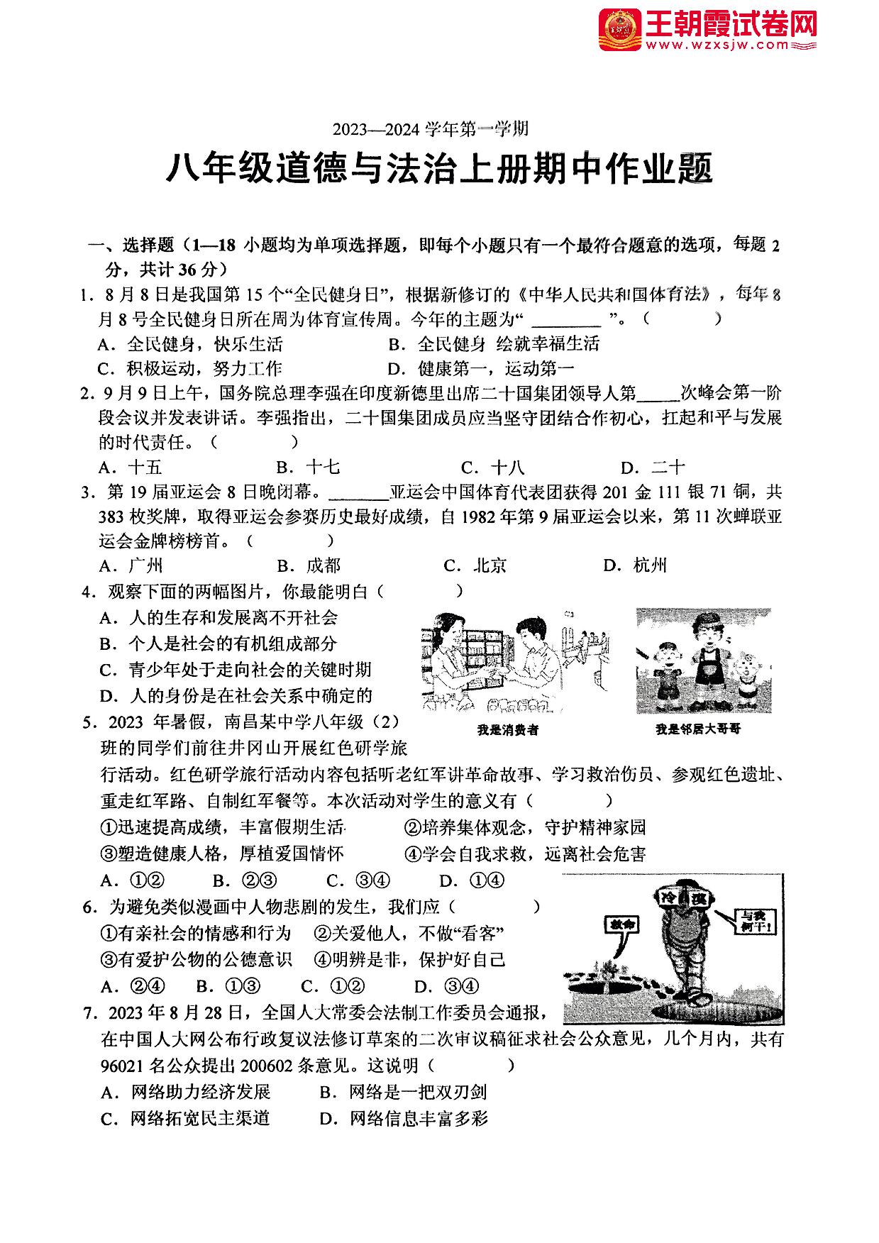 江西省鹰潭市余江区2023-2024学年第一学期期中考试试题八年级道德与法治(人教版)