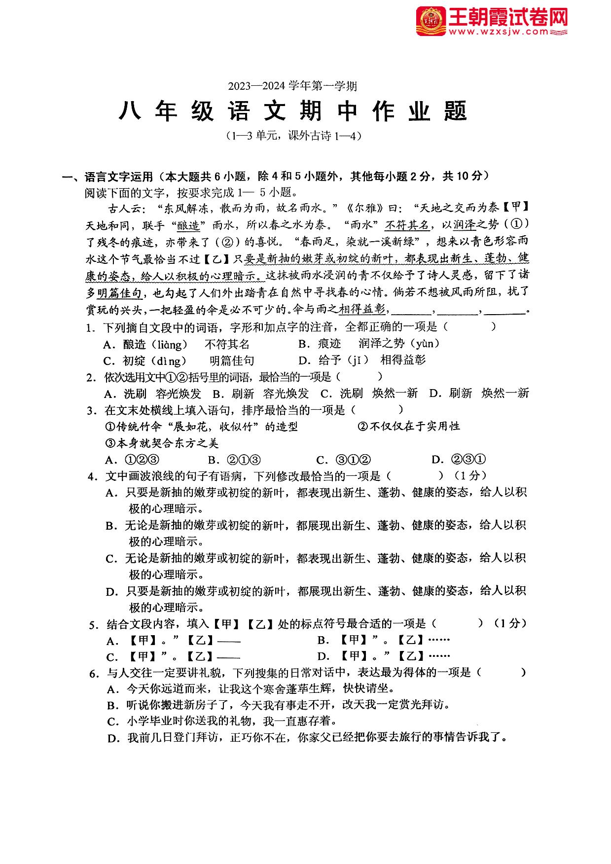 江西省鹰潭市余江区2023-2024学年第一学期期中考试试题八年级语文(人教版)