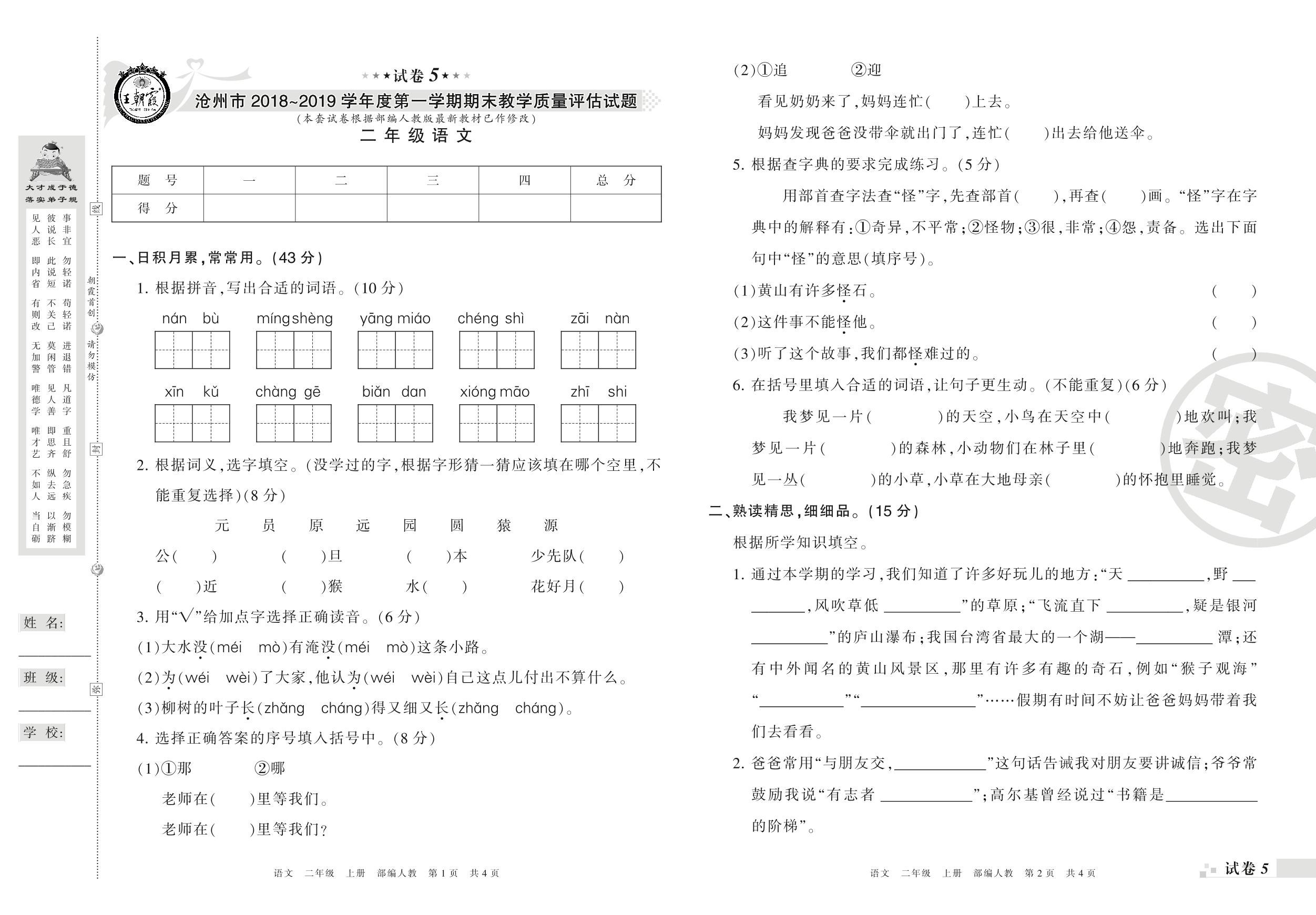 2018-2019学年第一学期沧州市二年级语文试卷(人教版)【5】