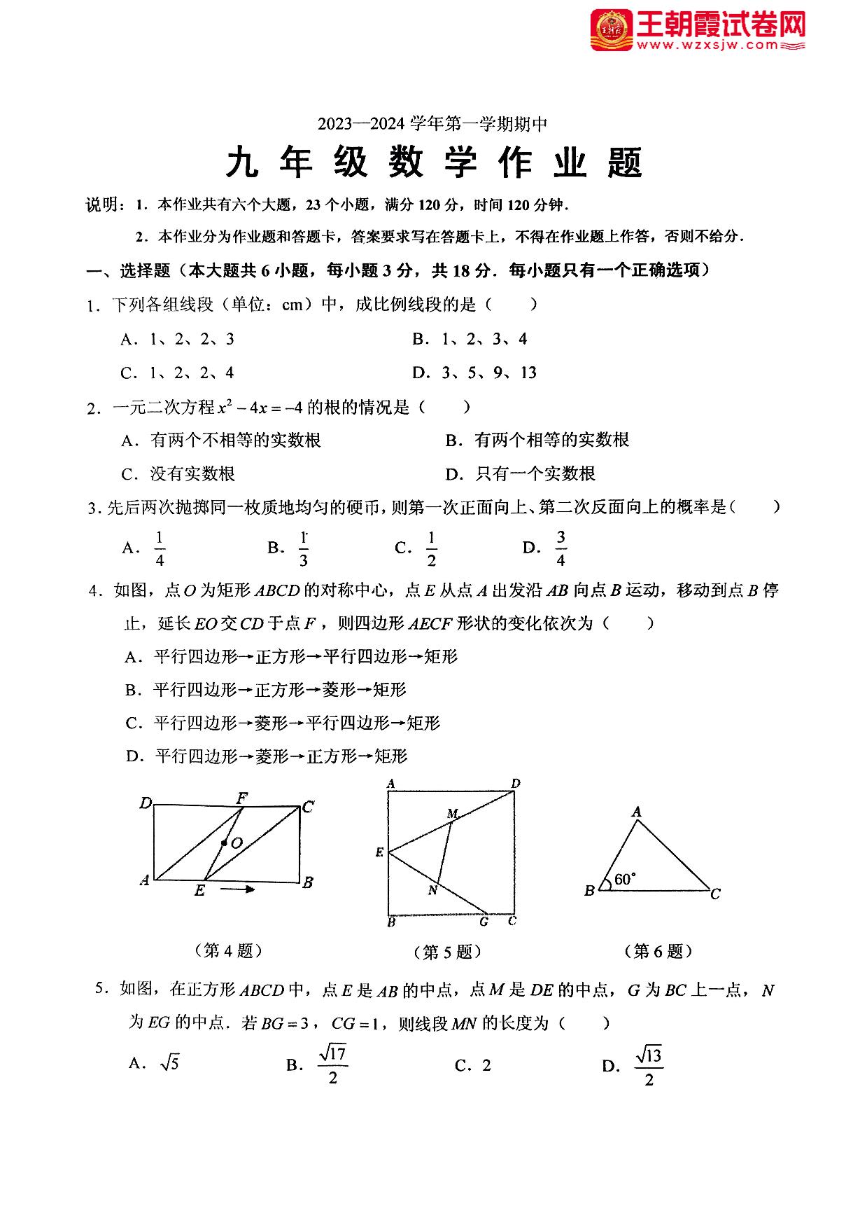 江西省鹰潭市余江区2023-2024学年第一学期期中考试试题九年级数学(北师版)