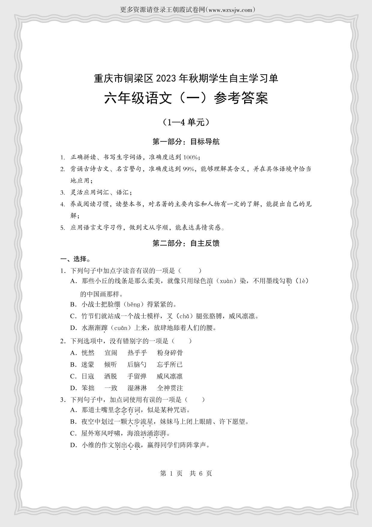 重庆市铜梁区2023-2024学年上学期学生自主学习单期中试卷六年级语文(人教版)