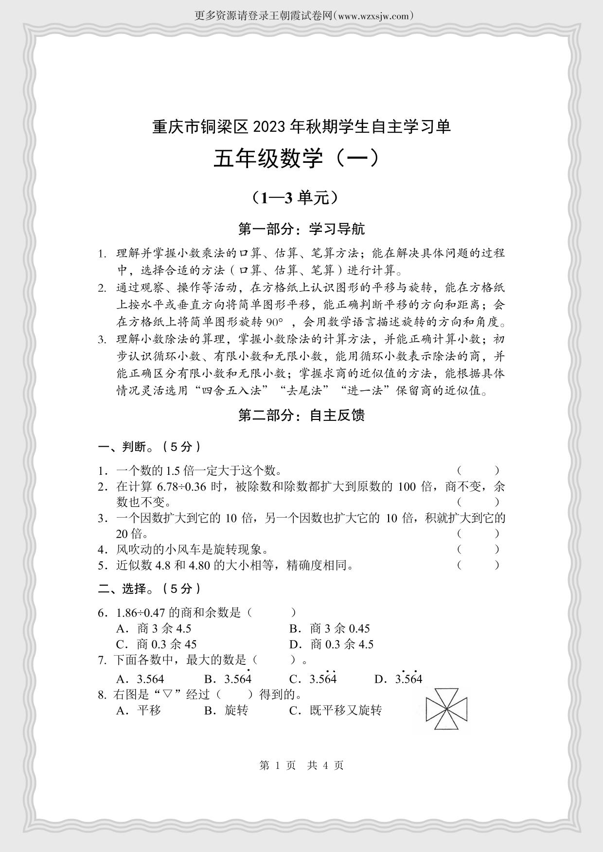 重庆市铜梁区2023-2024学年上学期学生自主学习单期中试卷五年级数学(西师版)