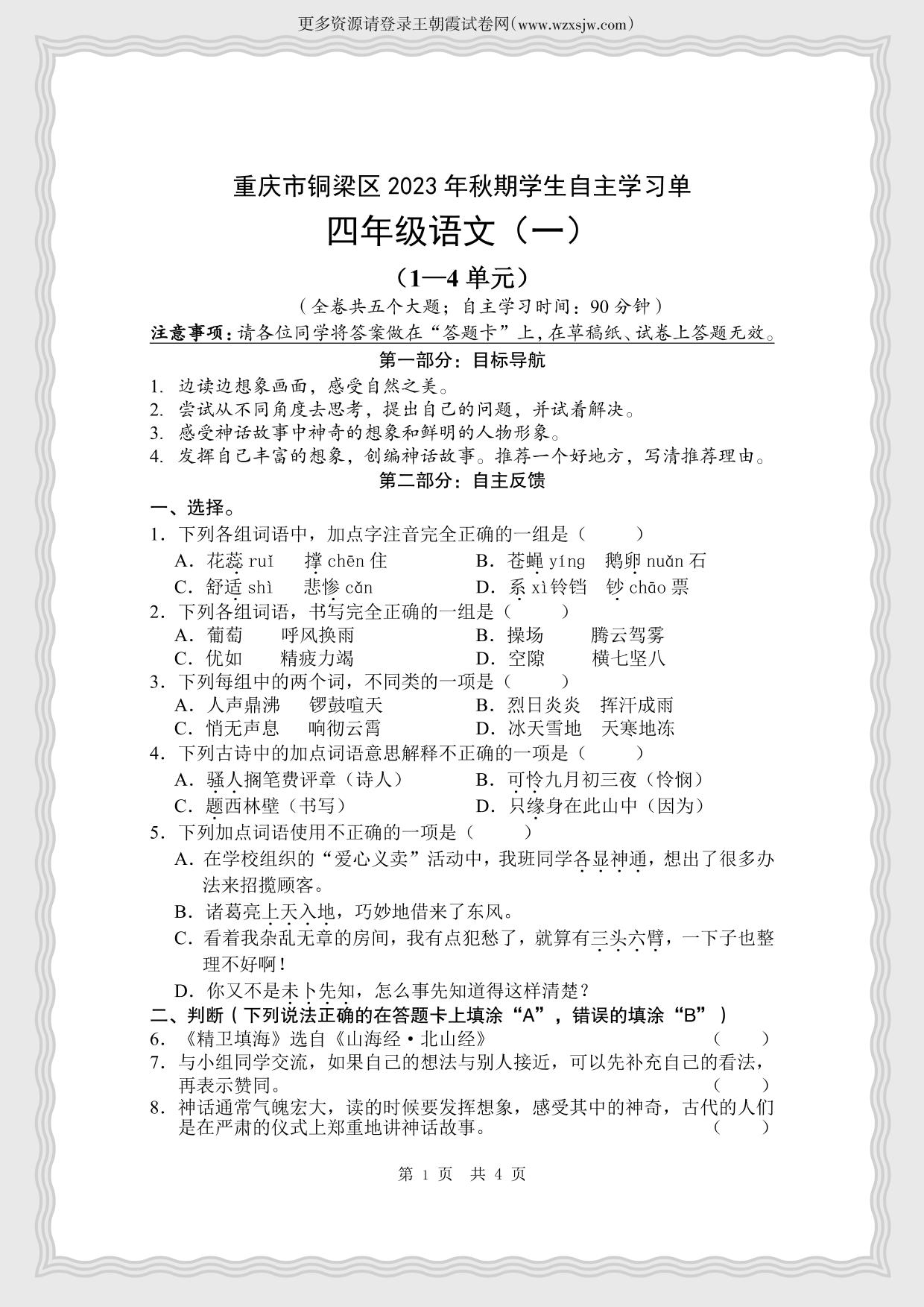 重庆市铜梁区2023-2024学年上学期学生自主学习单期中试卷四年级语文(人教版)