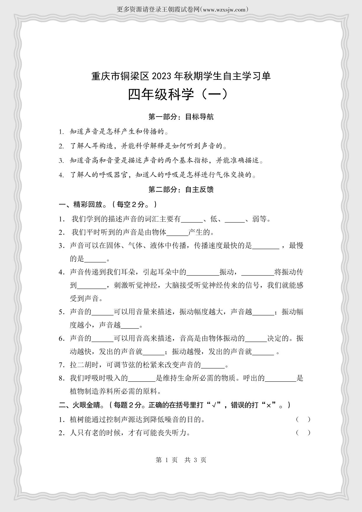 重庆市铜梁区2023-2024学年上学期学生自主学习单期中试卷四年级科学(教科版)