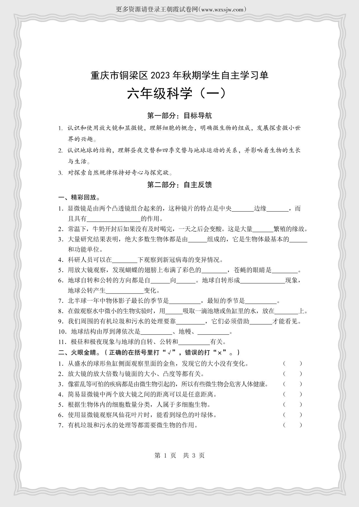 重庆市铜梁区2023-2024学年上学期学生自主学习单期中试卷六年级科学(教科版)