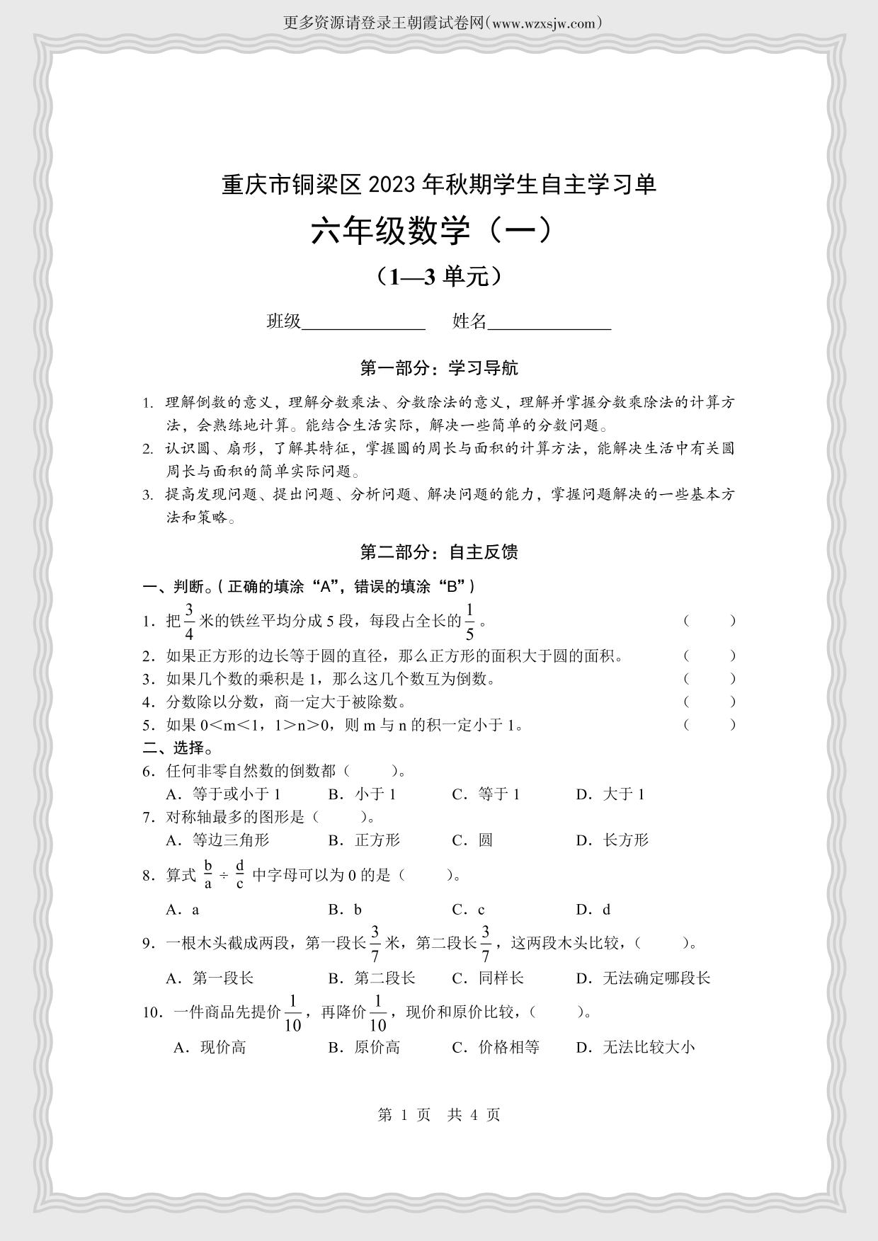 重庆市铜梁区2023-2024学年上学期学生自主学习单期中试卷六年级数学(西师版)