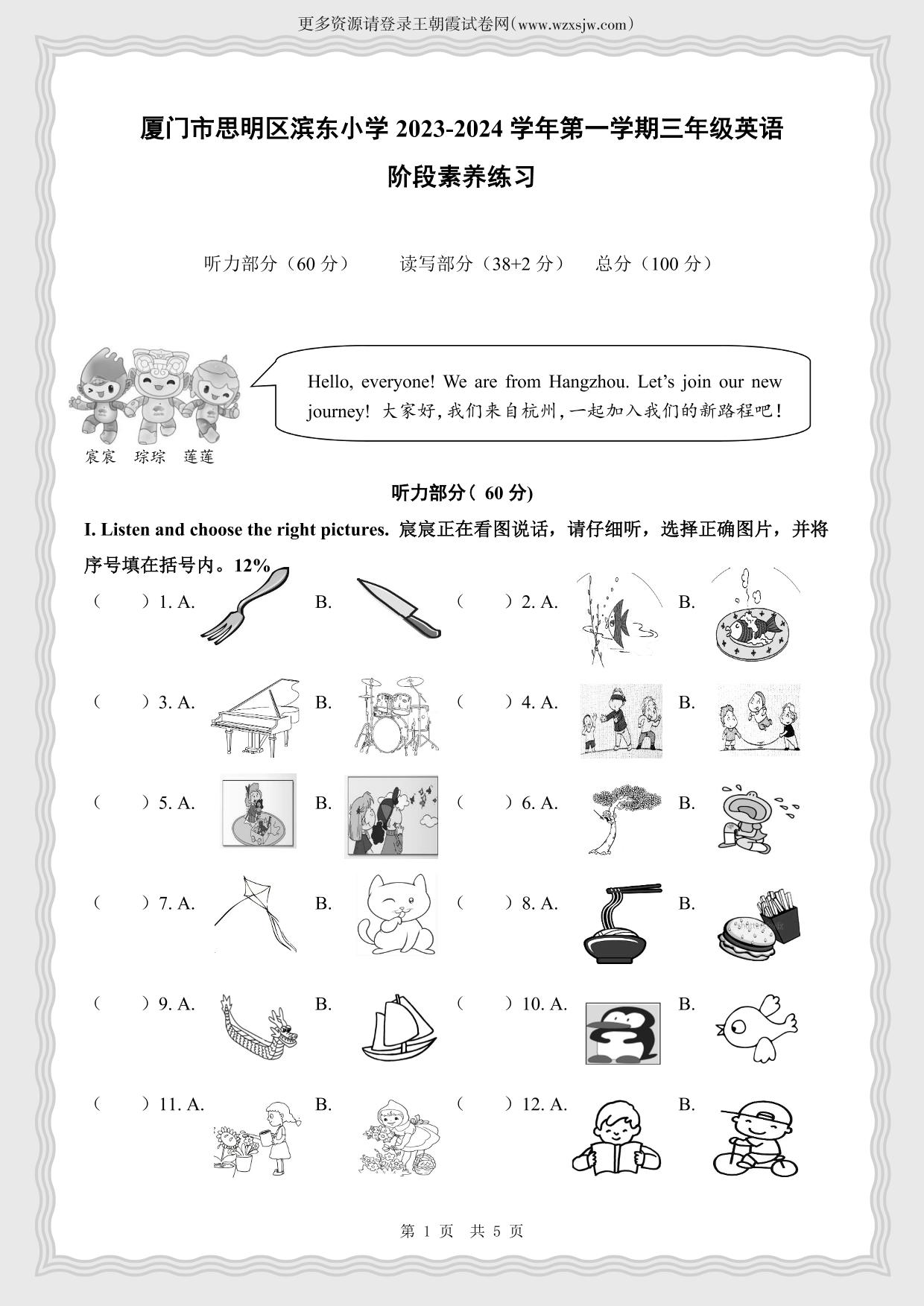 福建省厦门市思明区滨东小学2023-2024学年第一学期期中阶段素养练习三年级英语外研版(一起始)