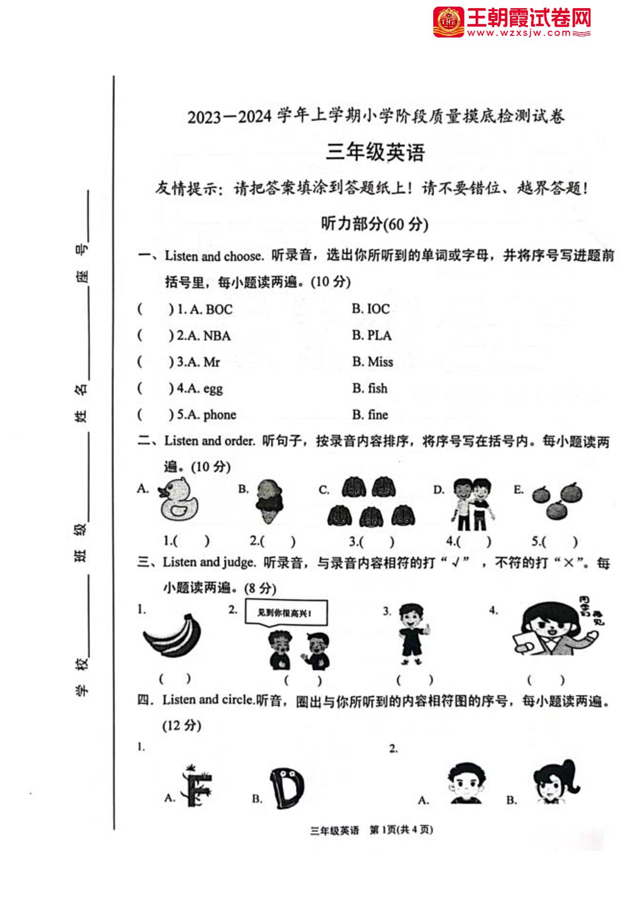 福建省漳州市龙海区2023-2024学年上学期小学阶段质量摸底检测试卷三年级英语(闽教版)【无听力音频】