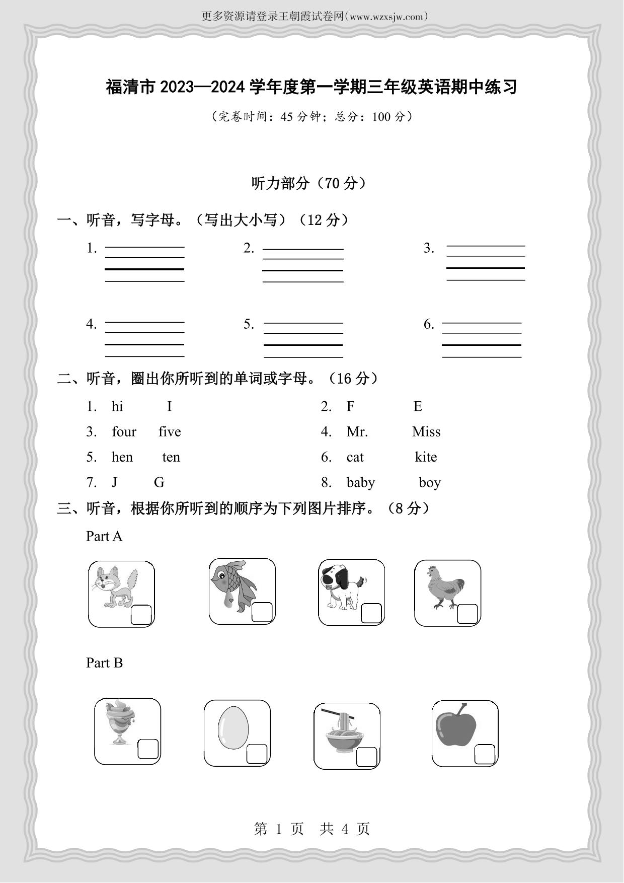 福建省福州市福清市2023—2024学年度第一学期小学期中练习卷三年级英语(闽教版)