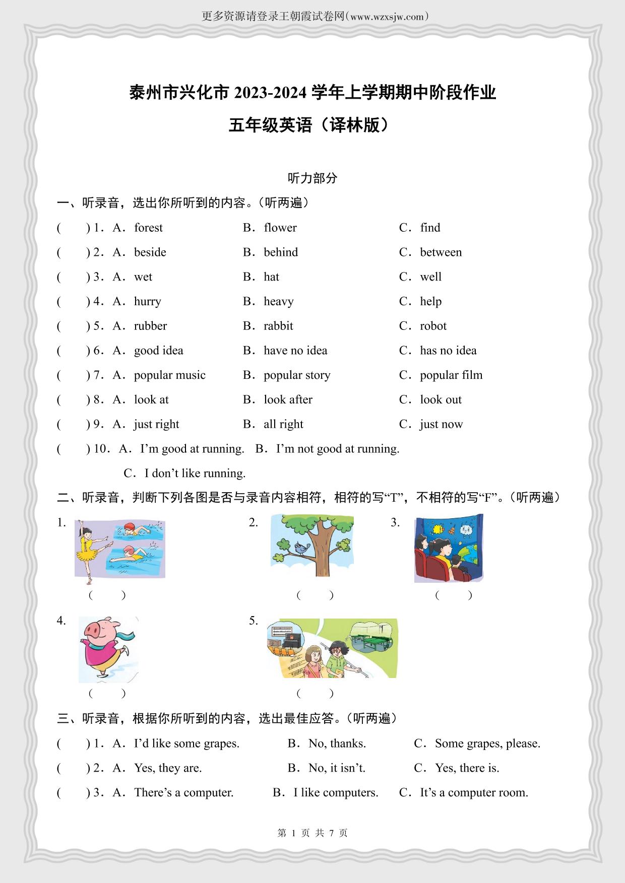 江苏省泰州市兴化市2023-2024学年上学期期中阶段作业五年级英语(译林版)【无听力音频】