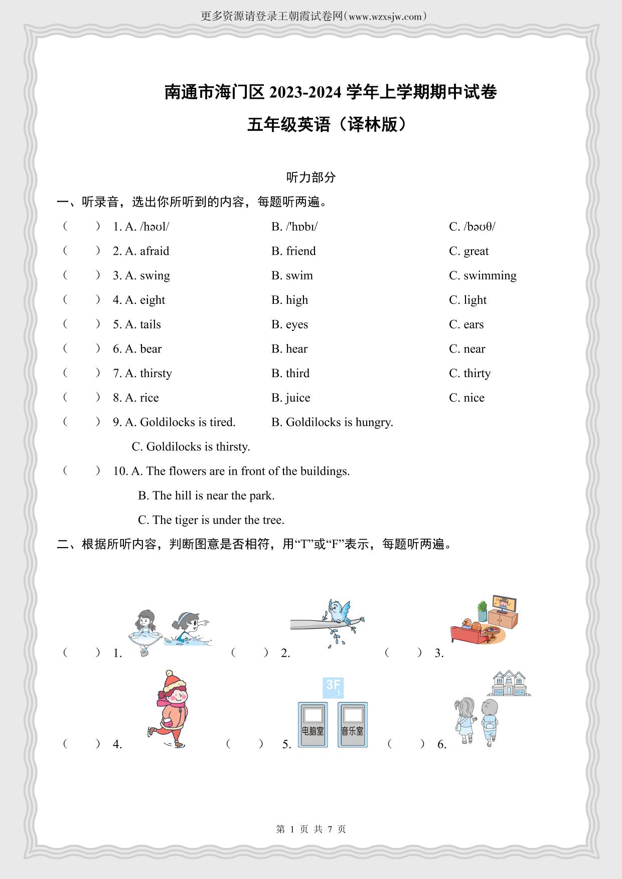 江苏省南通市海门区2023-2024学年上学期期中试卷五年级英语(译林版)