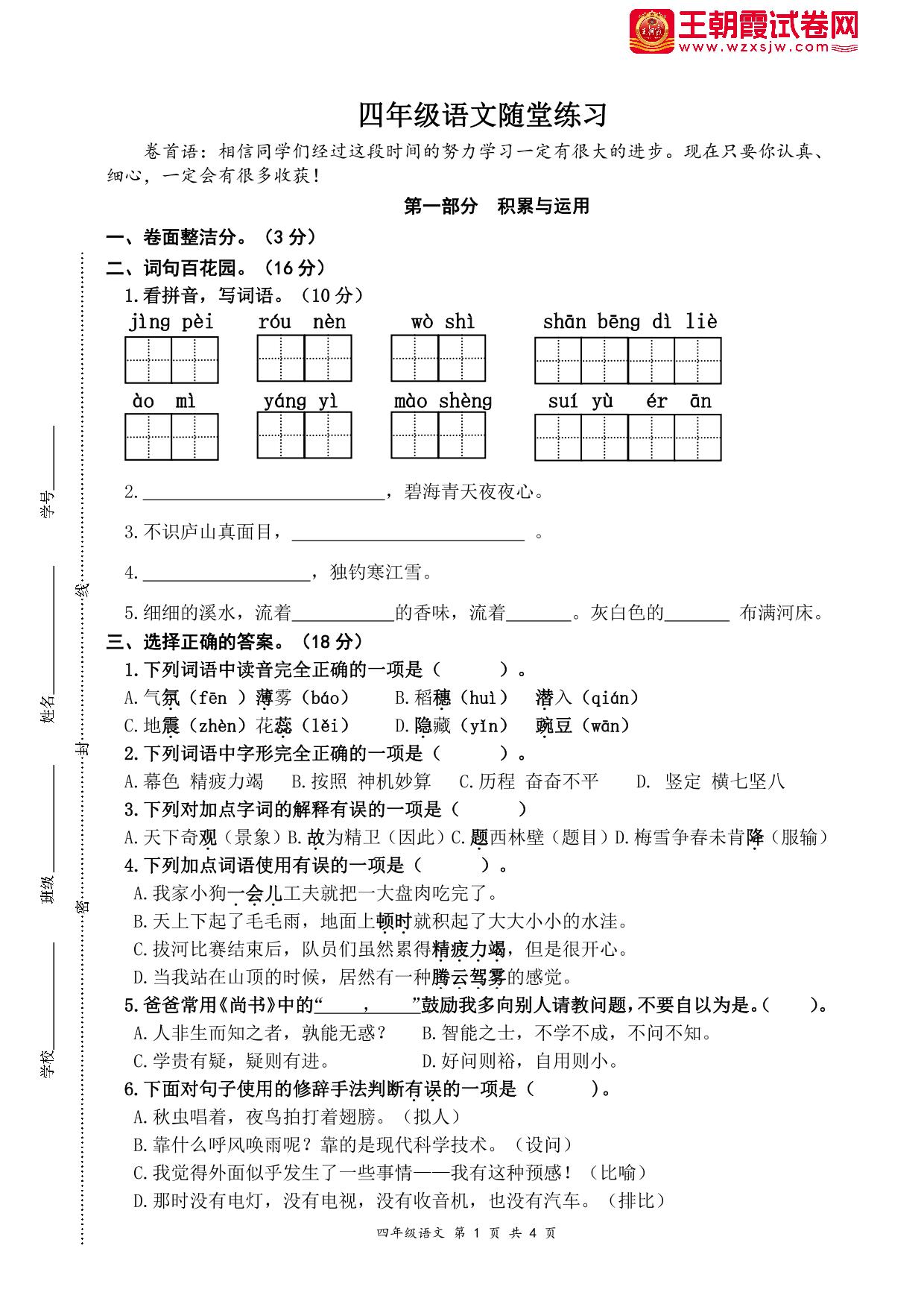 江苏省盐城市盐都区神州路小学教育集团2023-2024学年上学期11月期中试题四年级语文(人教版)