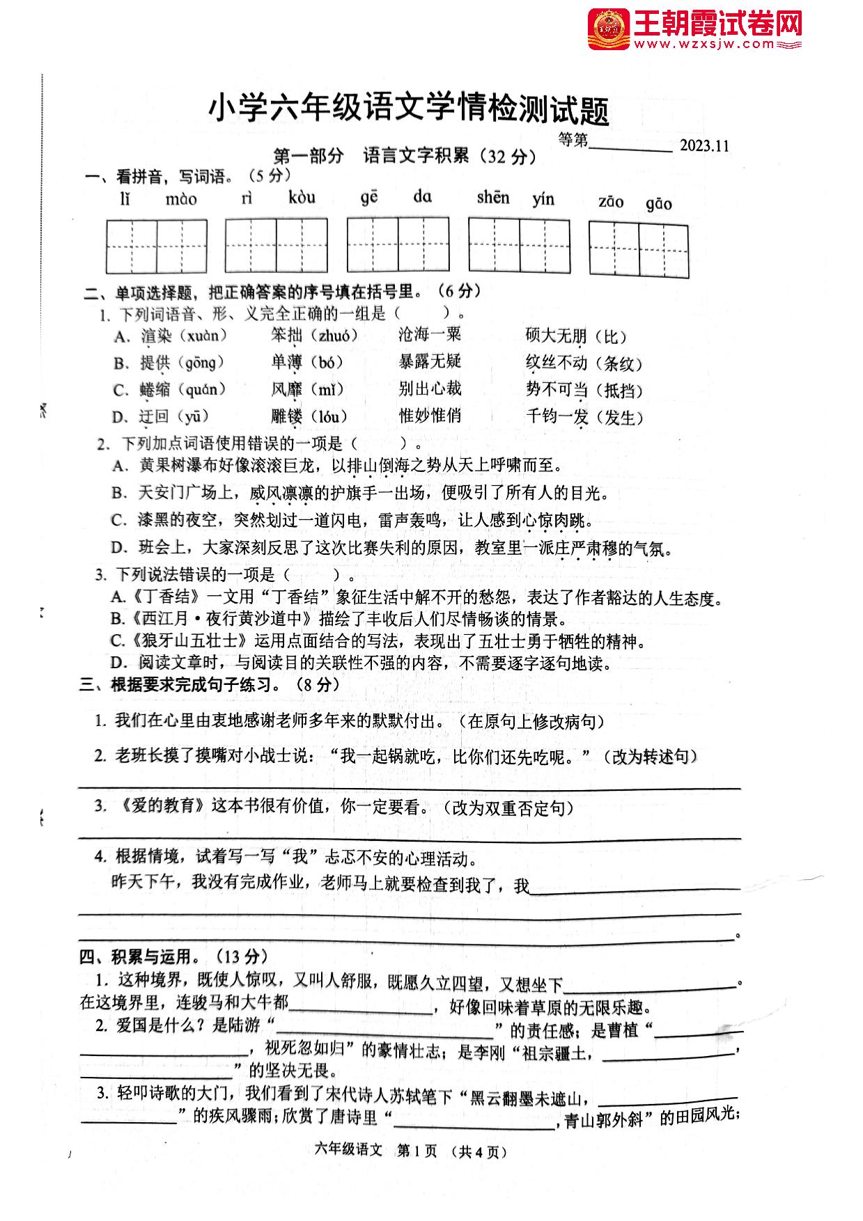 江苏省宿迁市沭阳县2023-2024学年上学期期中学情检测试题六年级语文(人教版)