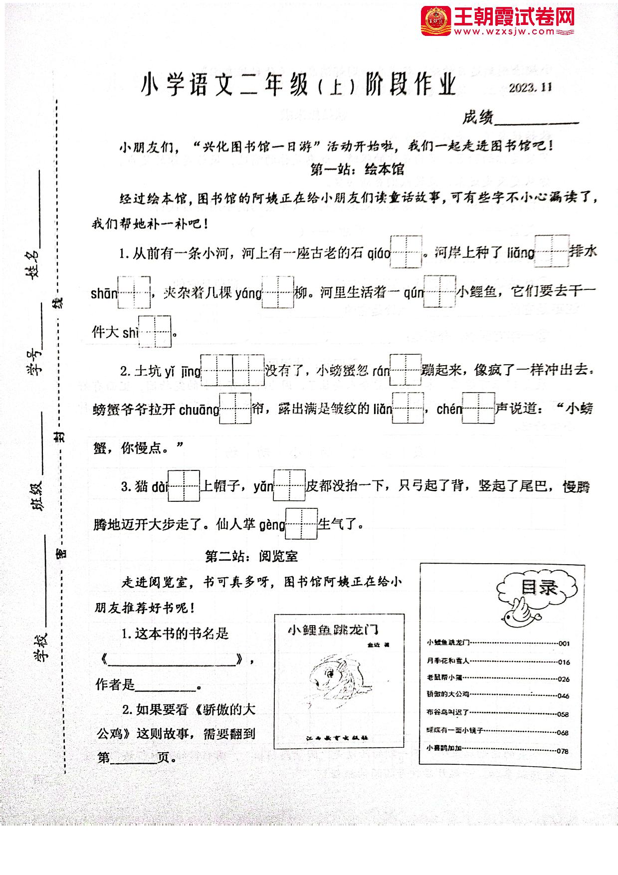 江苏省泰州市兴化市2023-2024学年上学期期中阶段作业二年级语文(人教版)
