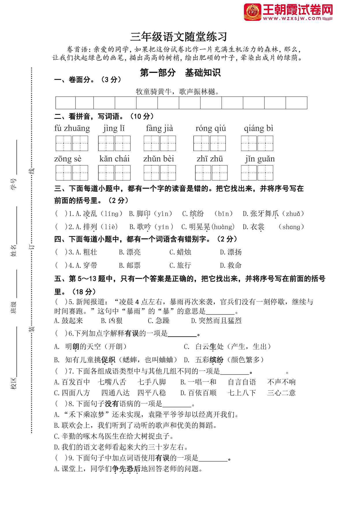 江苏省盐城市盐都区神州路小学教育集团2023-2024学年上学期11月期中试题三年级语文(人教版)