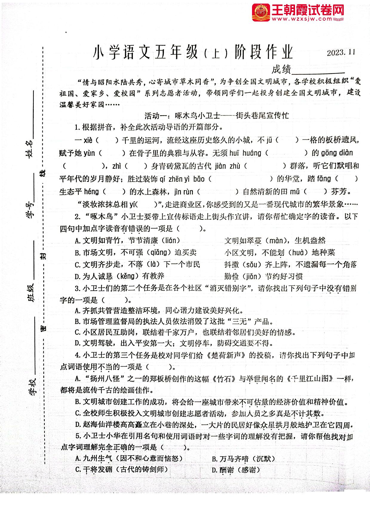 江苏省泰州市兴化市2023-2024学年上学期期中阶段作业五年级语文(人教版)