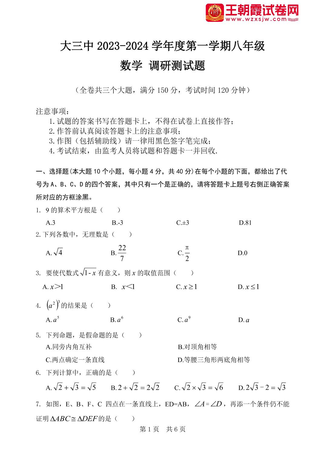 重庆市大学城第三中学校2023-2024学年度第一学期期中调研测试题八年级数学(华师版)