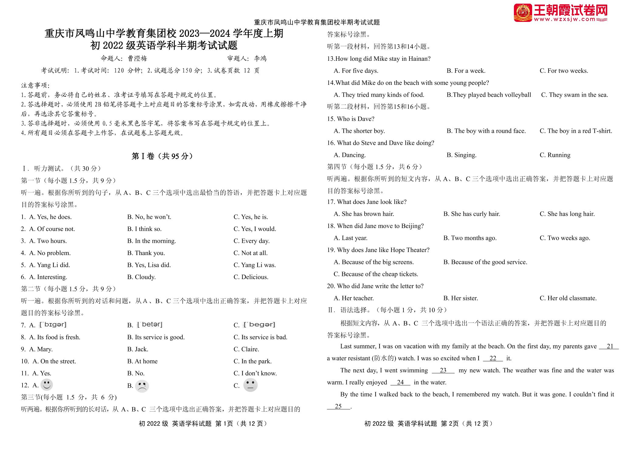 重庆市凤鸣山中学教育集团校2023-2024学年度上学期期中考试试题八年级英语(人教版)