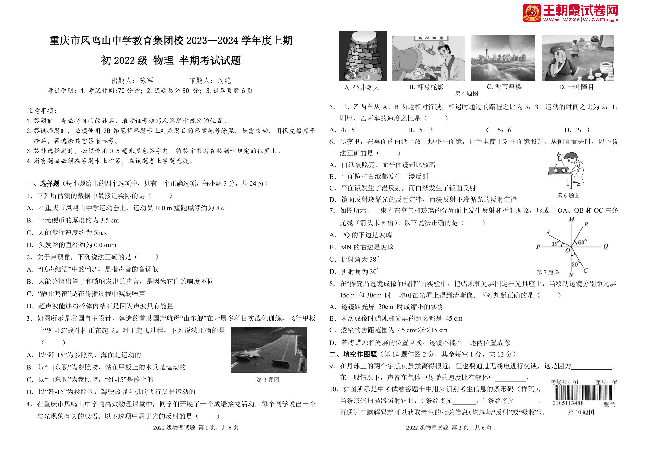 重庆市凤鸣山中学教育集团校2023-2024学年度上学期期中考试试题八年级物理(沪科版)