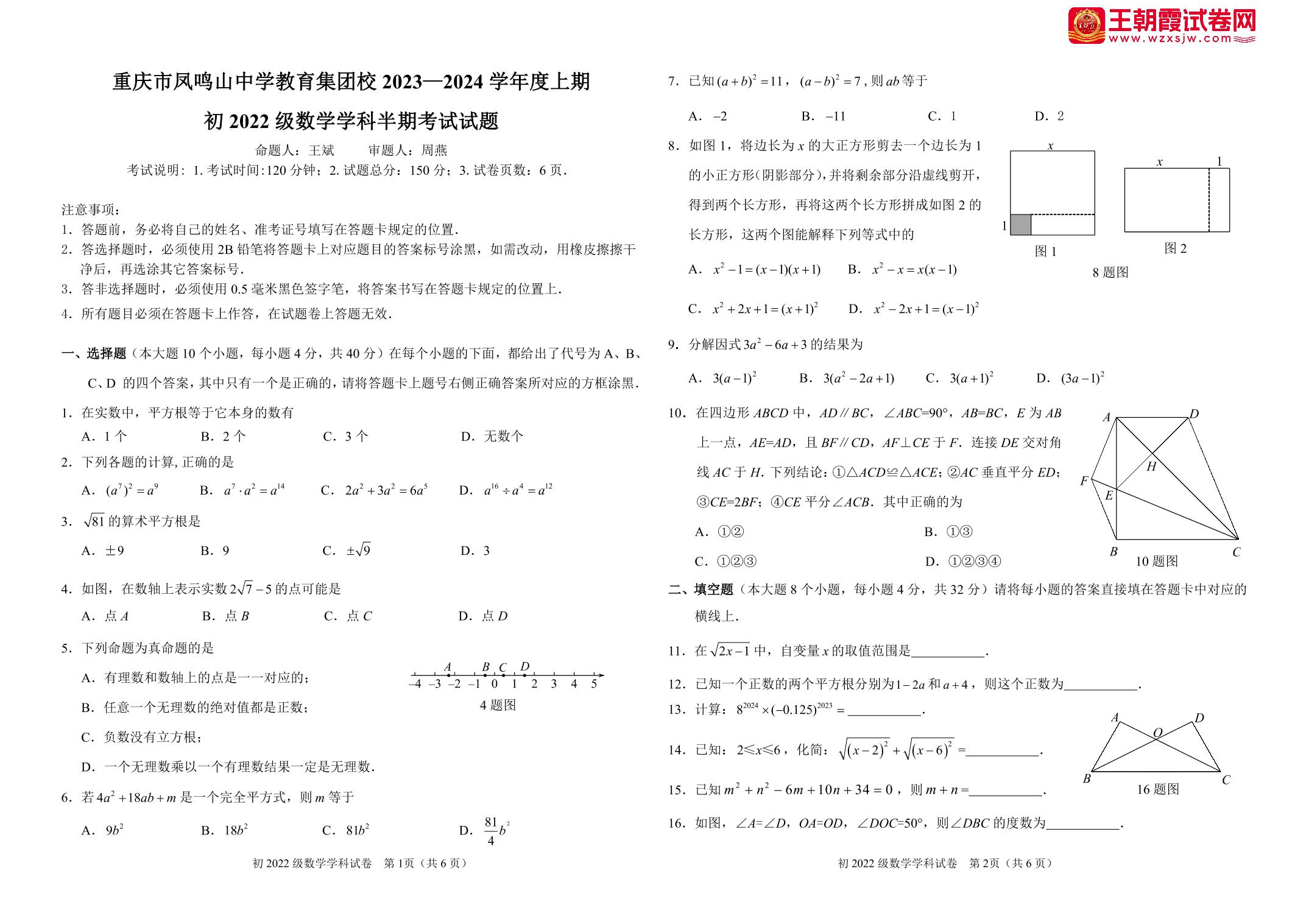 重庆市凤鸣山中学教育集团校2023-2024学年度上学期期中考试试题八年级数学(华师版)