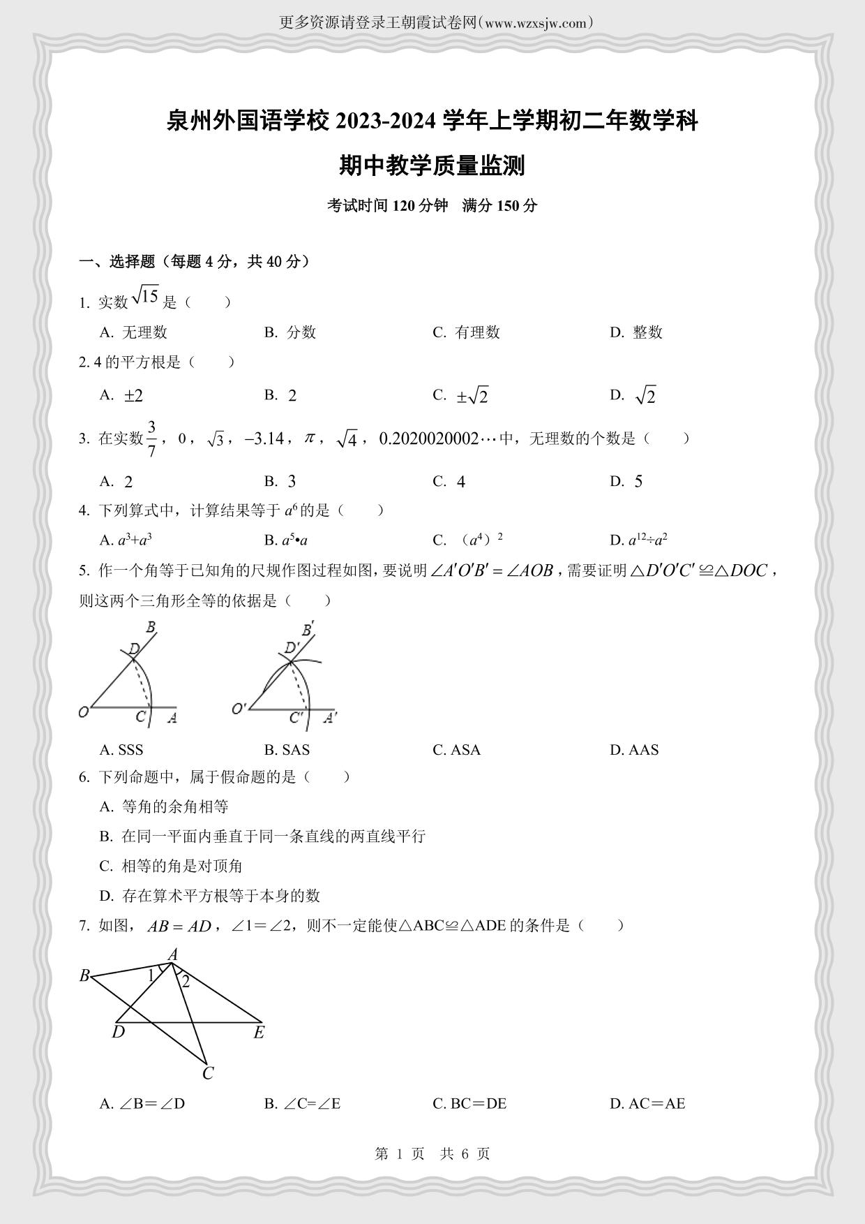 福建省泉州外国语学校2023-2024学年第一学期期中教学质量监测八年级数学(华师版)