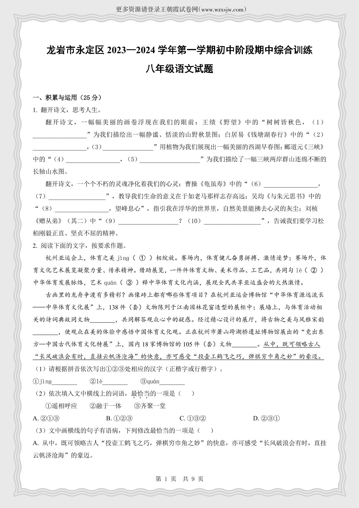 福建省龙岩市永定区2023-2024学年第一学期期中综合练习八年级语文(人教版)