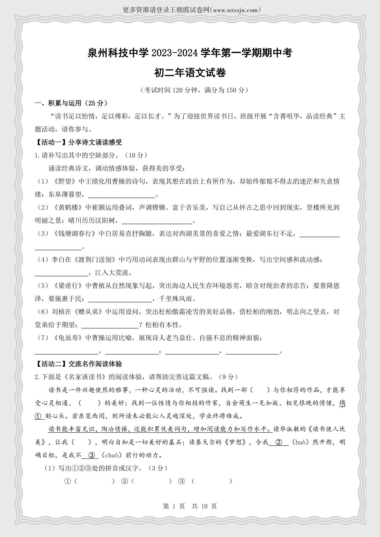 福建省泉州科技中学2023-2024学年第一学期期中考八年级语文(人教版)