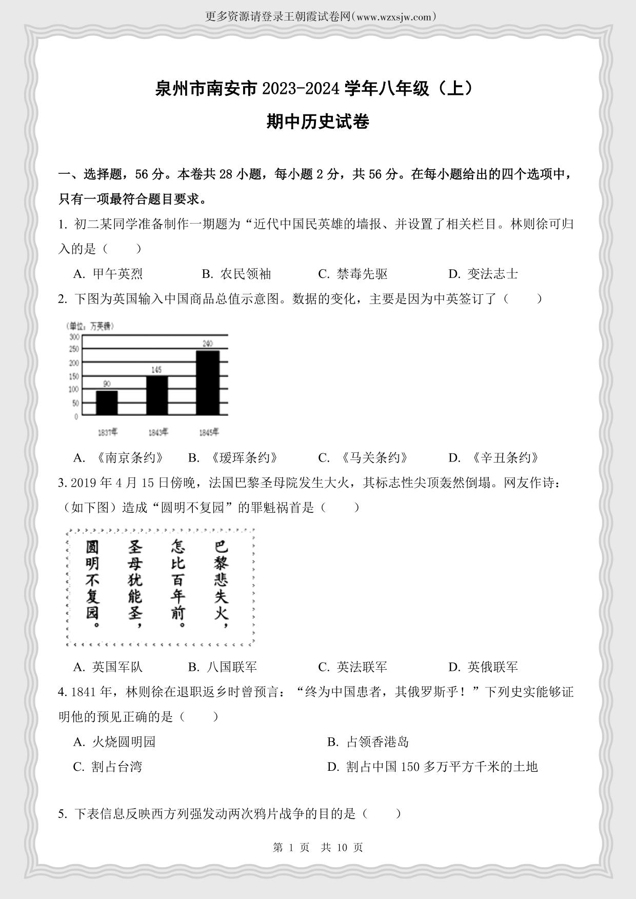 福建省泉州市南安市2023-2024学年第一学期期中试卷八年级历史(人教版)